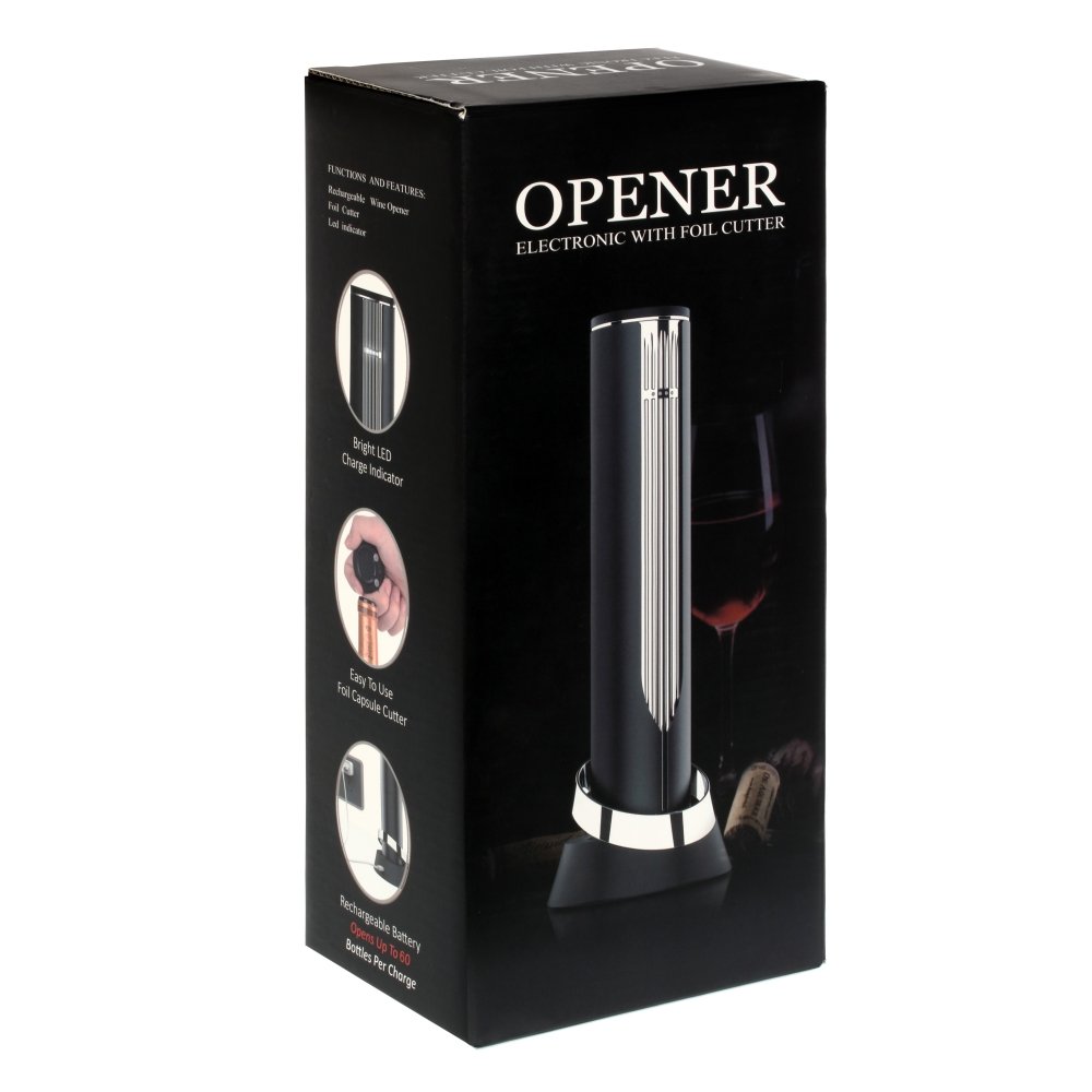 Электронный штопор с аккумулятором и с резцом для удаления фольги автоматически извлекает пробку из бутылки, удаляет пробку из штопора. Предназначен для пробок из натуральных и искусственных материалов. Имеет встроенный аккумулятор (при полной зарядке позволяет открыть до 60 бутылок).