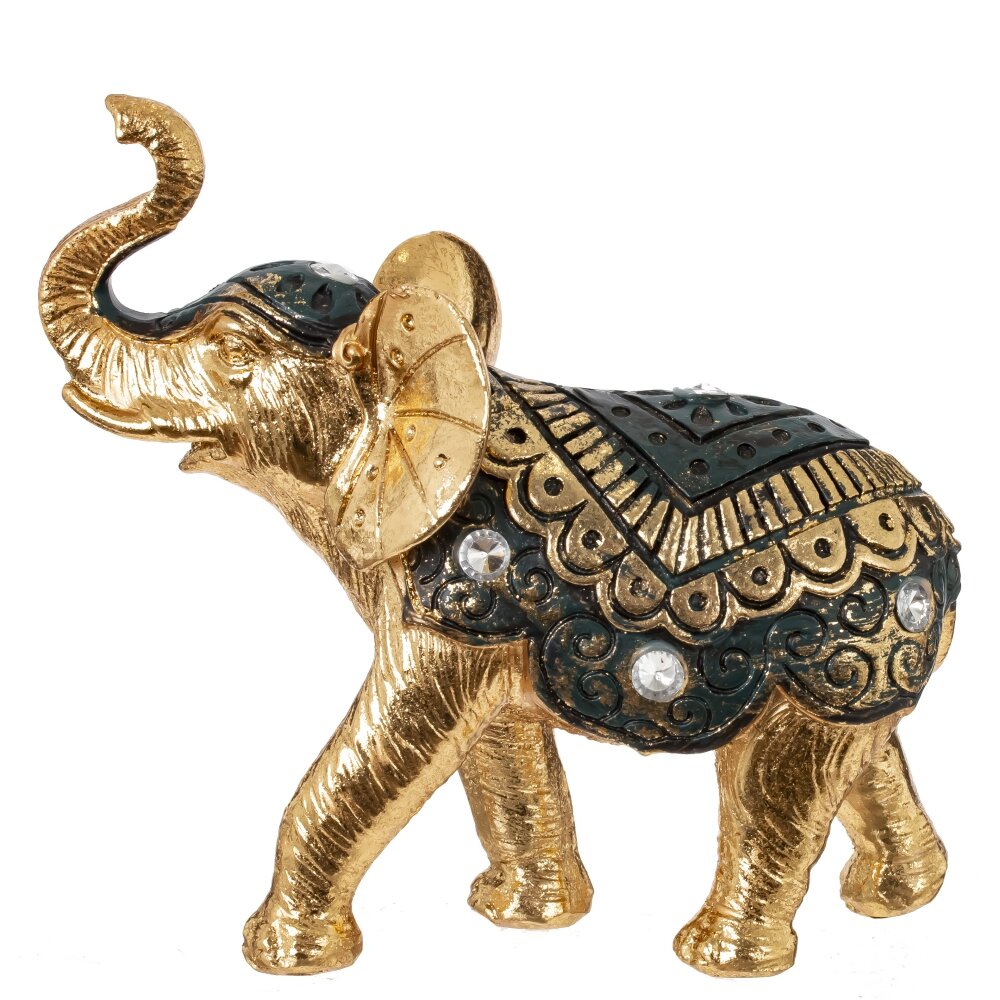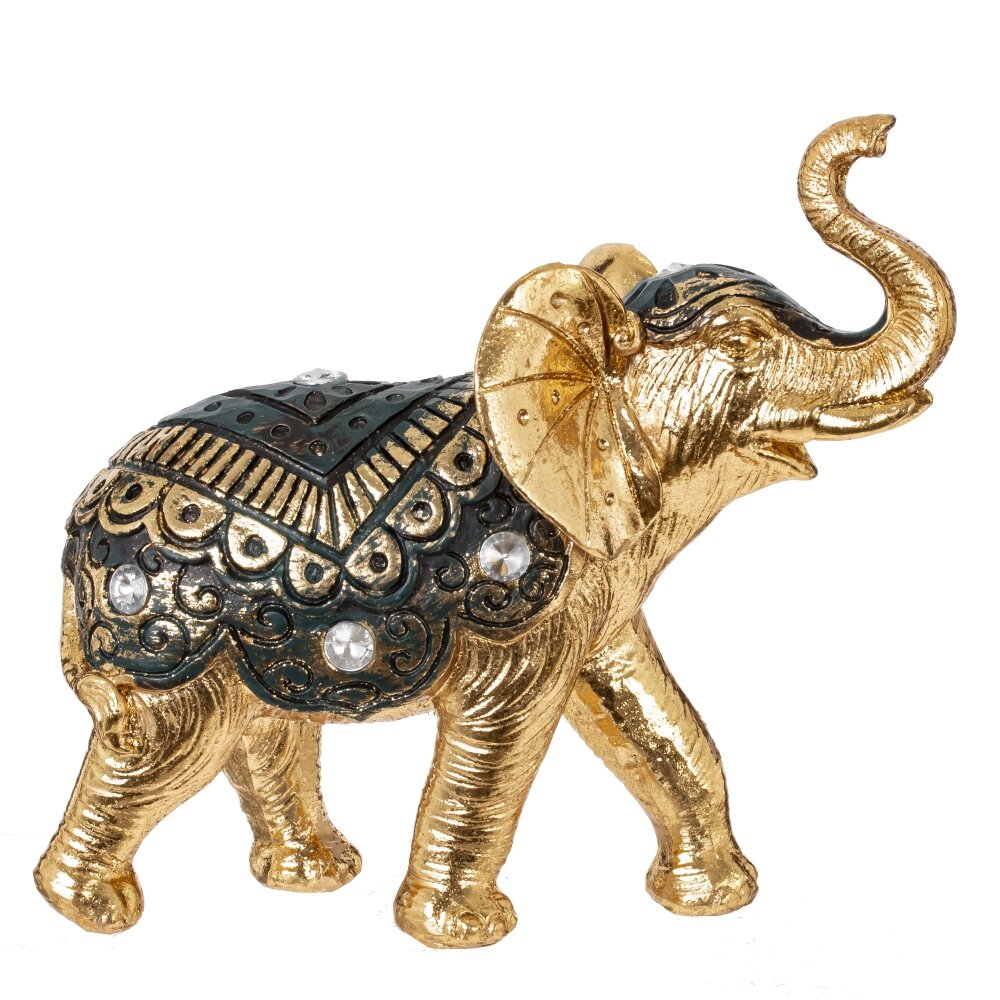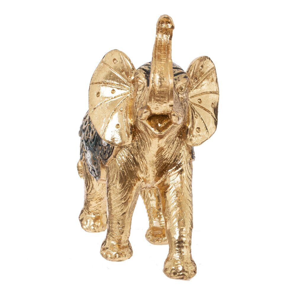 Элегантная декоративная фигурка слона станет изысканным украшением интерьера и символом удачи и благополучия. Изделие выполнено в золотом цвете с роскошными узорами и стразами, придающими ему благородный вид. Фигура передает грацию и силу этого величественного животного, а поднятый вверх хобот традиционно считается символом удачи. Такая статуэтка идеально впишется в классический или восточный стиль интерьера, добавив нотки изысканности и роскоши. Отличный вариант для подарка или украшения дома.