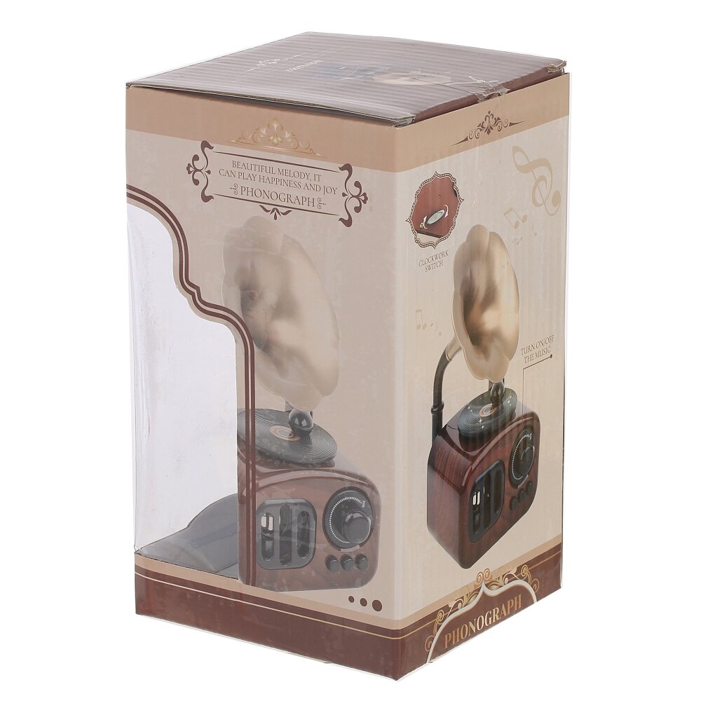 Декоративное изделие «Граммофон» — миниатюрная музыкальная модель в ретро-стиле. Корпус выполнен из полимерных материалов с имитацией полированного дерева, рупор металлический, благородного бронзового оттенка. На верхней панели — мини-пластинка и тонарм, спереди декоративные элементы управления. Встроенный пружинный механизм запускается заводным ключом и проигрывает мелодию, создавая атмосферу старинного салона. Легкая и прочная конструкция, устойчивое основание. Идеально для украшения интерьера, фотозоны, рабочего стола или витрины, станет запоминающимся сувениром и подарком любителям винтажной эстетики.