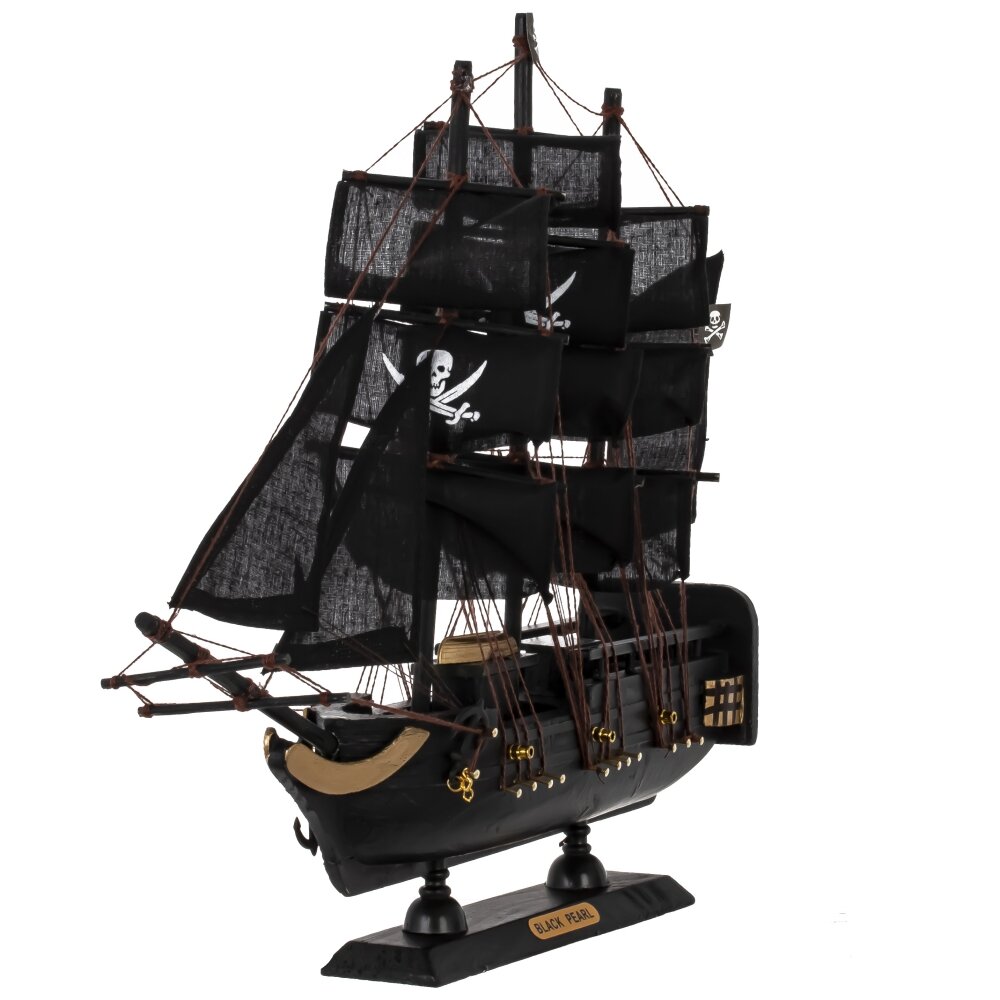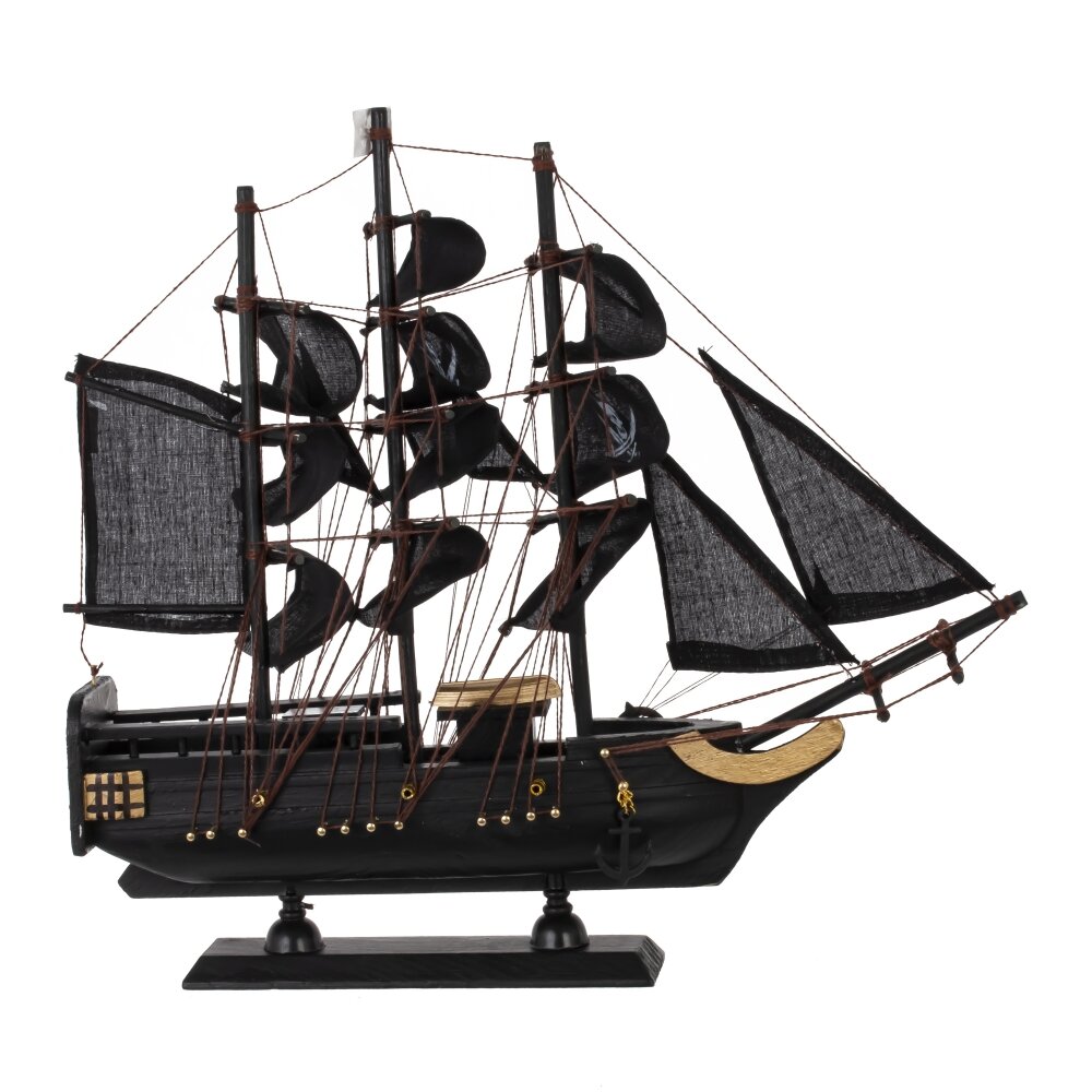 Декоративное изделие «Корабль» выполнено из различных материалов: дерева, текстиля, полимерных материалов и металла. Этот макет пиратского корабля выполнен с высокой степенью детализации: корпуса из черного дерева украшены золотистыми декоративными элементами, а паруса с пиратскими символами – черепом и костями – изготовлены из текстильного материала. Тонкие металлические детали, такие как якорь и цепи, придают изделию особую выразительность. Композиция дополнена подставкой с надписью «black pearl». Такой корабль украсит любую комнату, добавив в интерьер элемент морской тематики и загадки.