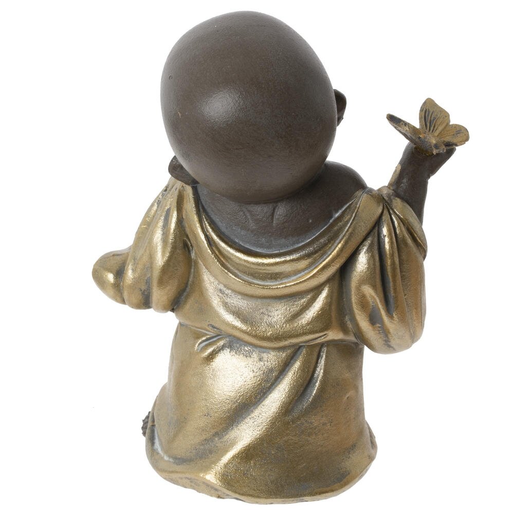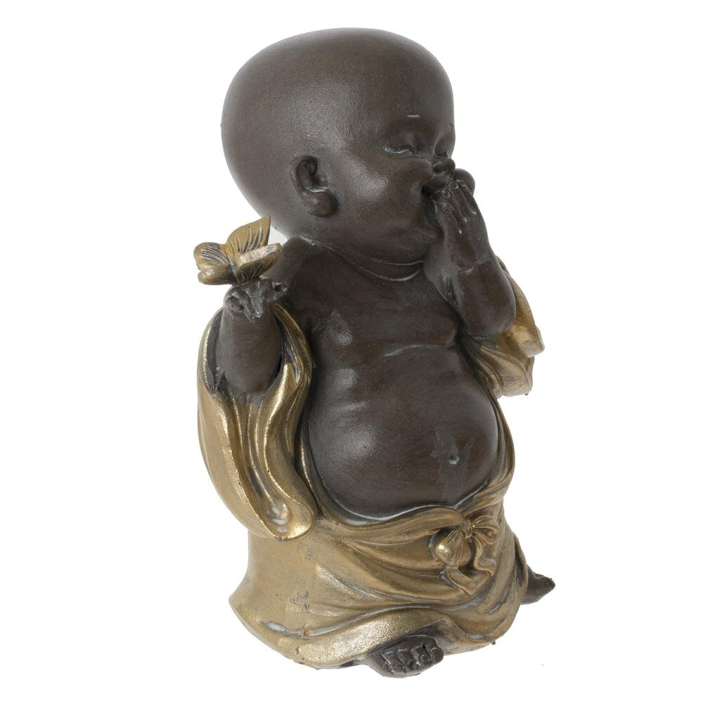 Очаровательная декоративная фигурка в виде маленького монаха-будды станет изысканным украшением вашего интерьера. Скульптура выполнена из качественного материала с эффектной двухцветной отделкой: темно-коричневый корпус гармонично сочетается с золотистыми одеждами. Фигурка изображает улыбающегося младенца-монаха в характерной позе - одна рука поднесена к лицу, а в другой он держит бабочку. Детально проработанные складки одежды, выразительные черты лица и округлый животик придают изделию особое обаяние и символизируют беззаботность, радость и процветание. Идеально подходит для оформления гостиной, спальни, кабинета или медитативного уголка. Станет отличным подарком ценителям восточной культуры и философии.