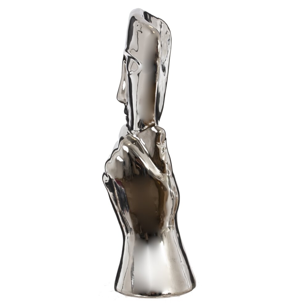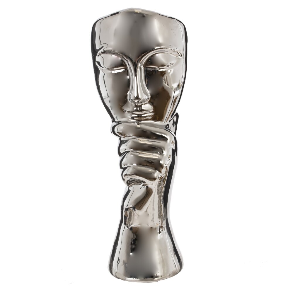 Эта декоративная фарфоровая фигурка выполнена в современном стиле и представляет собой стилизованное лицо с изящными чертами, опирающееся на руку. Благодаря зеркальной серебристой поверхности она выглядит элегантно и эффектно, отражая свет и создавая интересные визуальные эффекты. Такой аксессуар станет стильным украшением интерьера, добавив нотку загадочности и искусства в любое пространство. Идеально подойдет для гостиной, кабинета или холла, а также может стать оригинальным подарком для ценителей необычного декора.