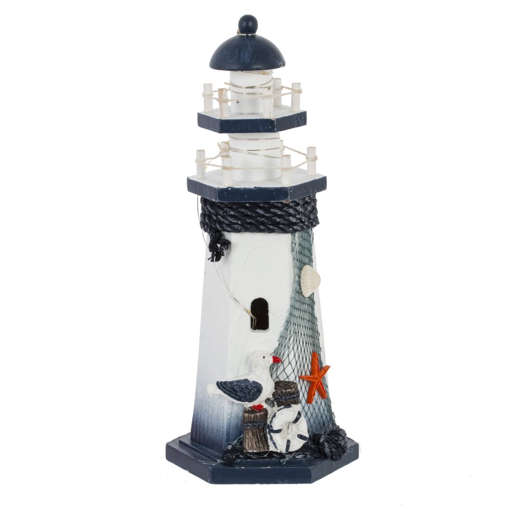Декоративная фигурка "Маяк" выполнена из дерева, полимерных и текстильных материалов, что придаёт ей оригинальный и интересный внешний вид. Изделие представлено в четырех вариантах. Каждый маяк с подсветкой и украшен морскими элементами: якорем, морской звездой, сетью и ракушками, что создаёт атмосферу морского побережья. Фигурка окрашена в спокойные бело-синие оттенки, которые ассоциируются с морем и свежестью. Благодаря детальной проработке и сочетанию различных материалов, маяк станет отличным украшением интерьера в морском стиле, добавит уюта и станет ярким акцентом на полке, подоконнике или в витрине. Такой аксессуар может стать прекрасным подарком для любителей морской тематики и путешествий. Работает от трех батареек LR44.