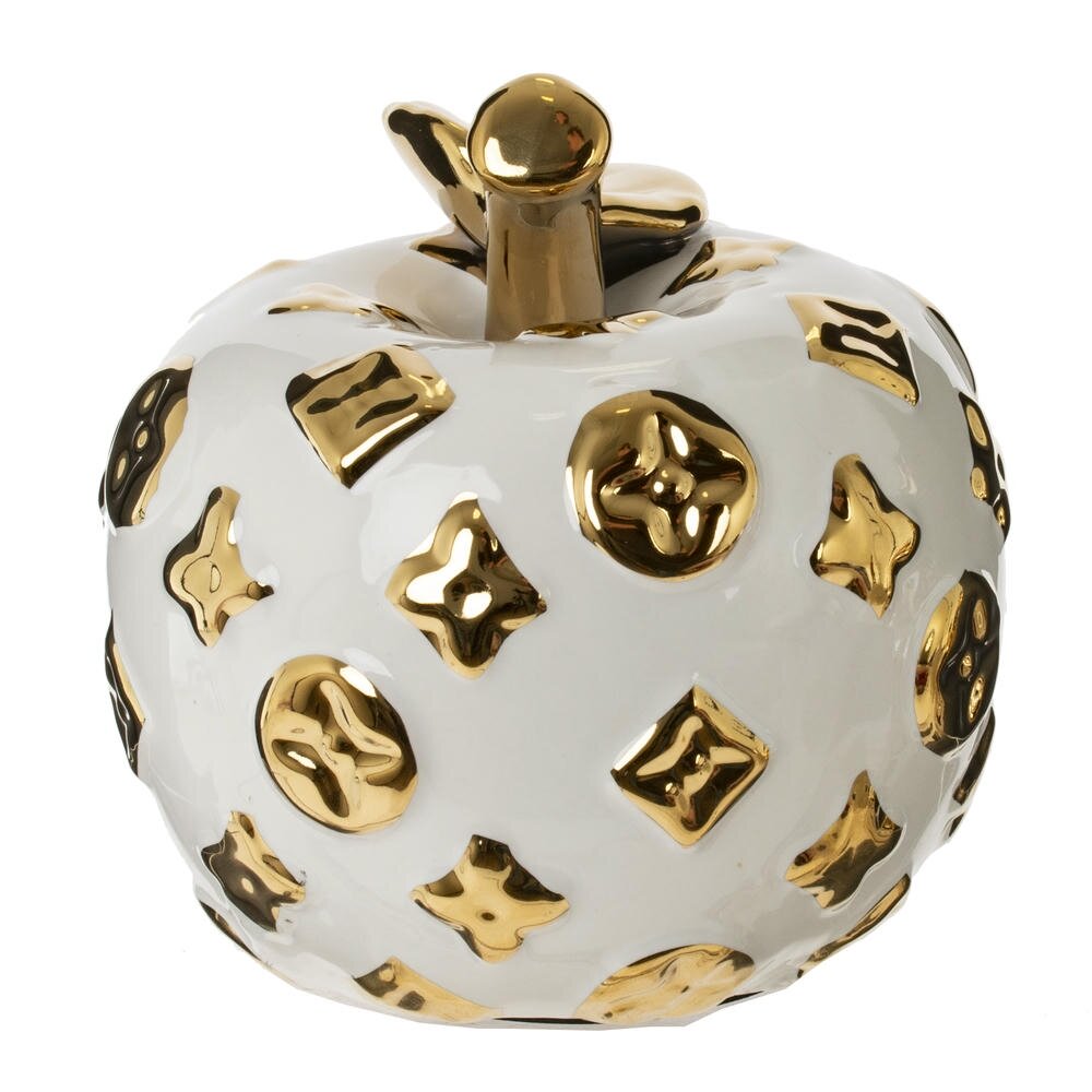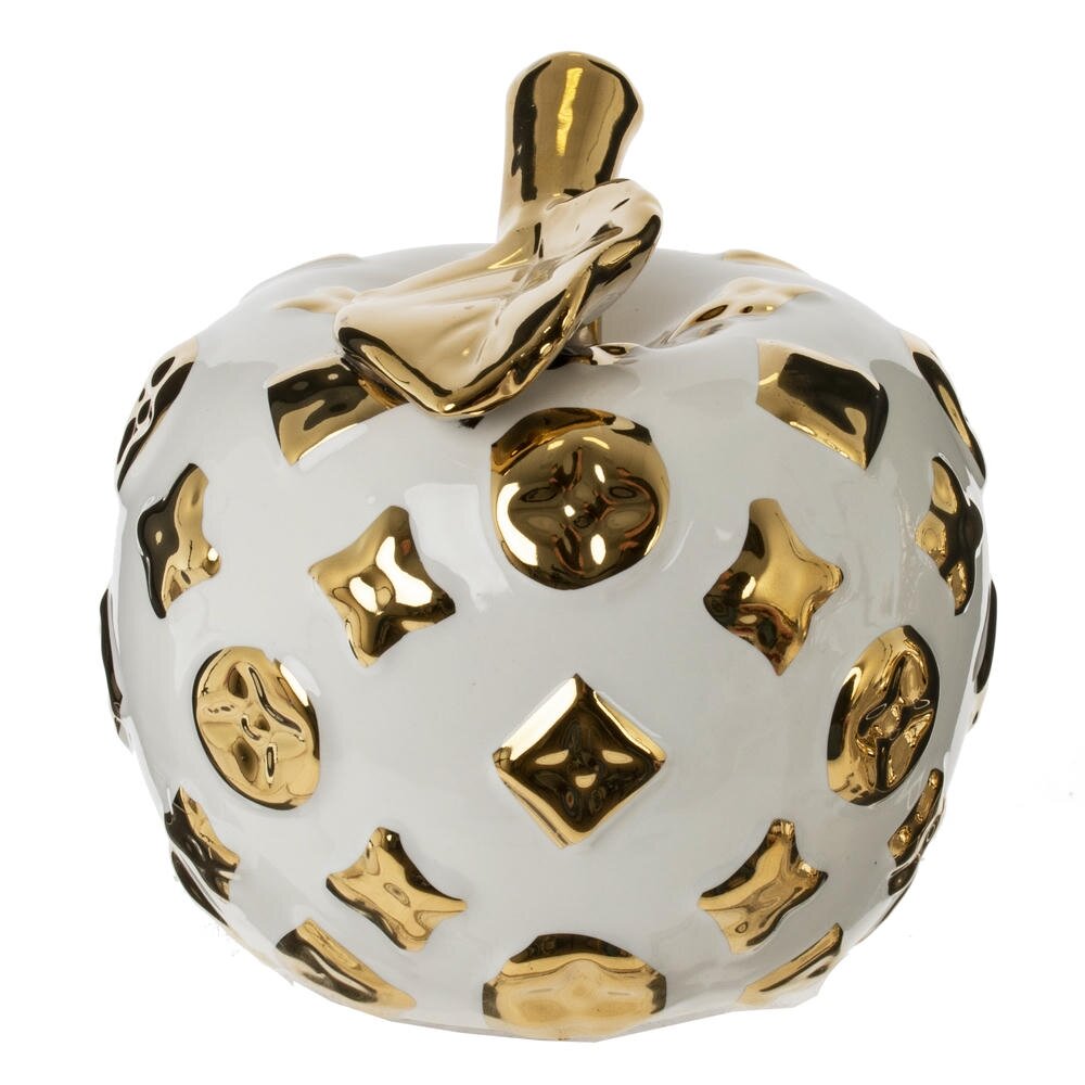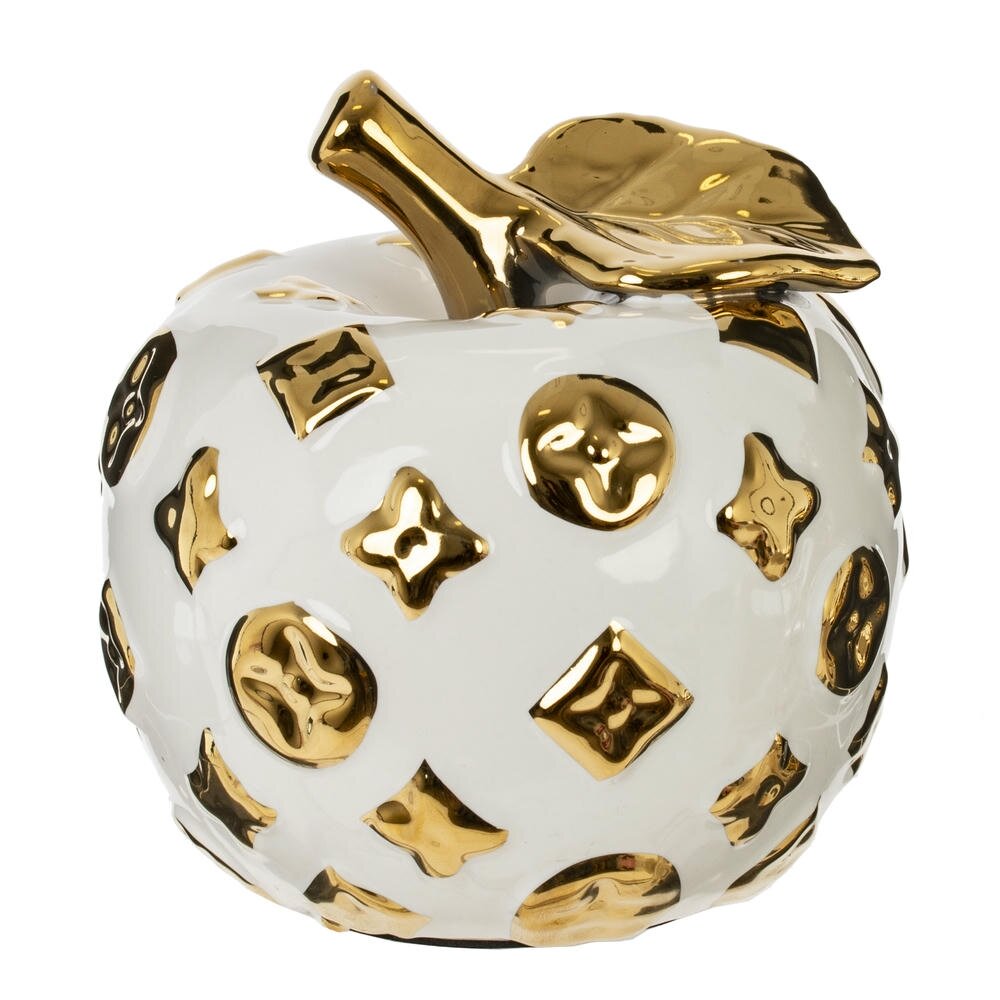 Декоративная фигурка «Яблоко» — стильный акцент для современного интерьера. Объёмная фарфоровая форма покрыта глянцевой белой глазурью и украшена выпуклыми декоративными элементами тёплого золотого оттенка. Золотистый лист и изящная веточка придают изделию утончённый, немного люксовый характер. Такая фигурка гармонично впишется в гостиную, спальню, кабинет или зону приёмной, станет эффектным дополнением на консоли, полке, журнальном столике или в витрине. Идеальный выбор для подарка ценителям оригинального декора и тем, кто любит выделять детали в пространстве.