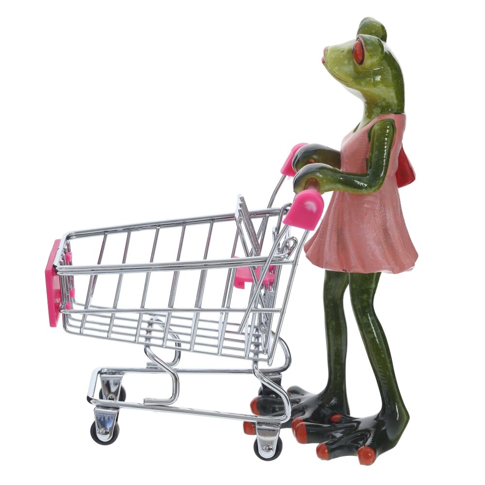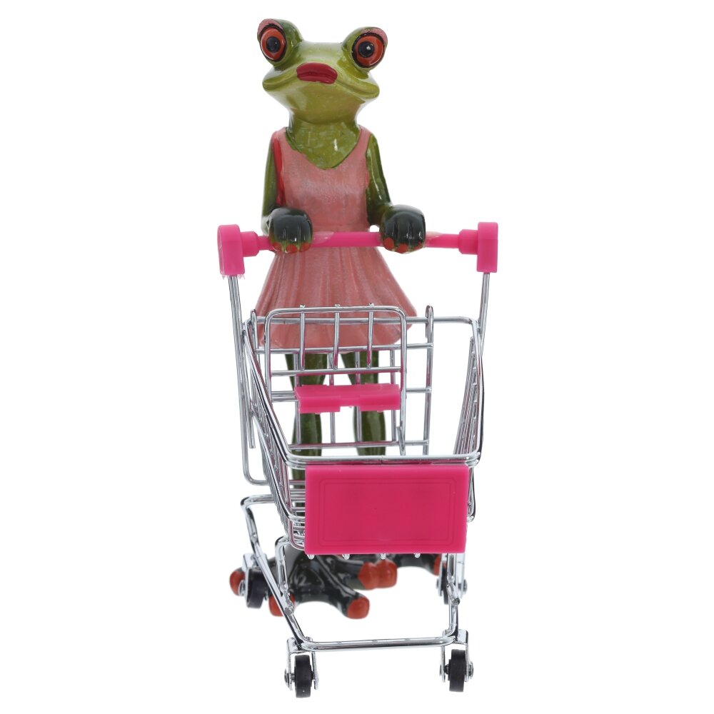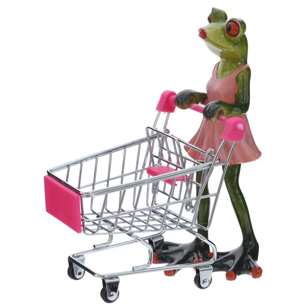 Оригинальная декоративная фигурка, выполненная из полимерных материалов. Она изображает лягушку, одетую в розовое платье, которая толкает миниатюрную тележку для покупок. Фигурка отличается яркой детализацией: большие выразительные глаза, проработанные лапки и аккуратное платье придают ей забавный и милый вид. Металлическая тележка с розовыми элементами прекрасно дополняет композицию, создавая ассоциацию с процессом шопинга. Такая фигурка станет отличным украшением интерьера, добавив в него нотку юмора и оригинальности, а также может быть прекрасным подарком для коллекционеров необычных предметов или просто любителей веселого декора. Компактные размеры и устойчивость позволяют разместить её на полке, рабочем столе или в детской комнате, привлекая внимание и вызывая улыбку.