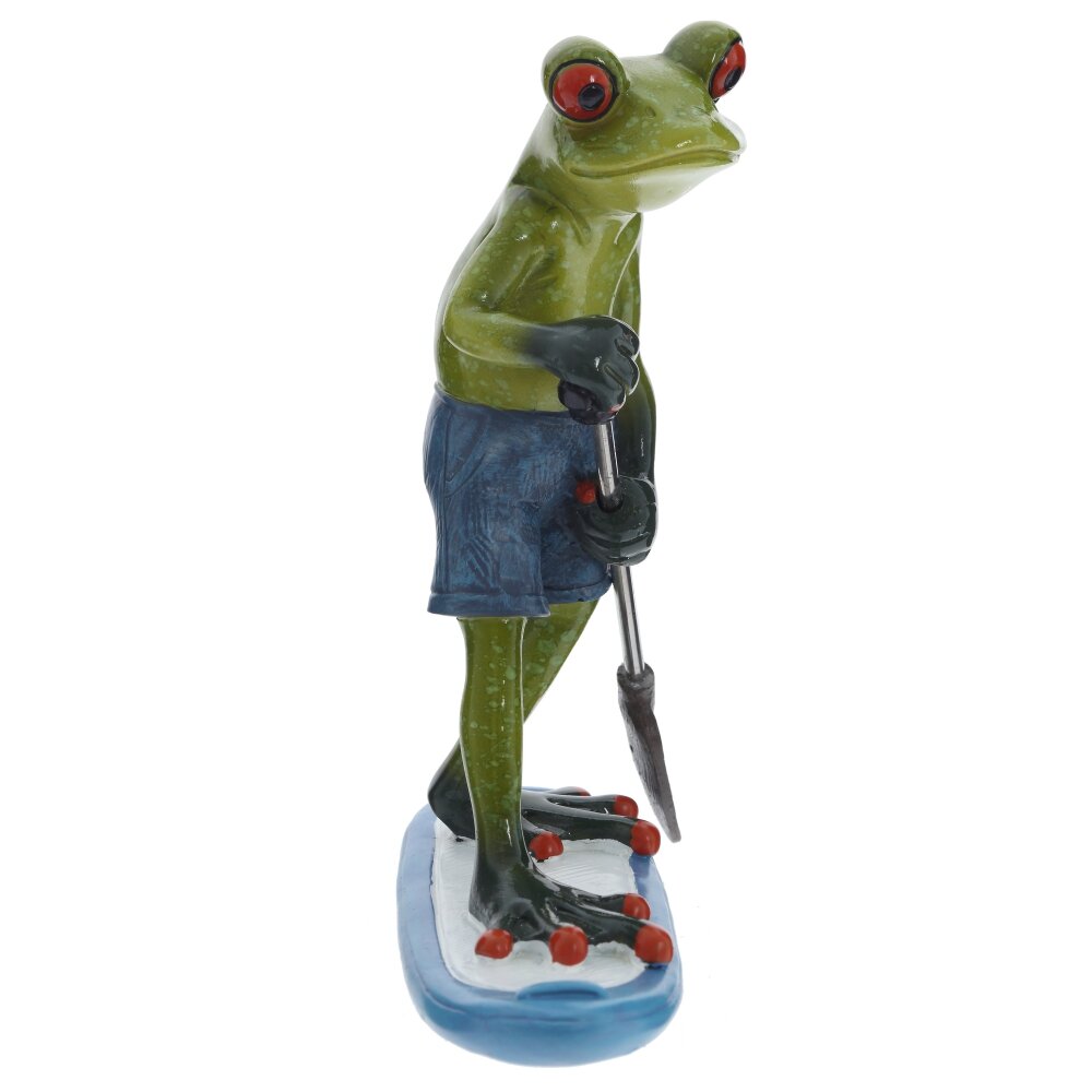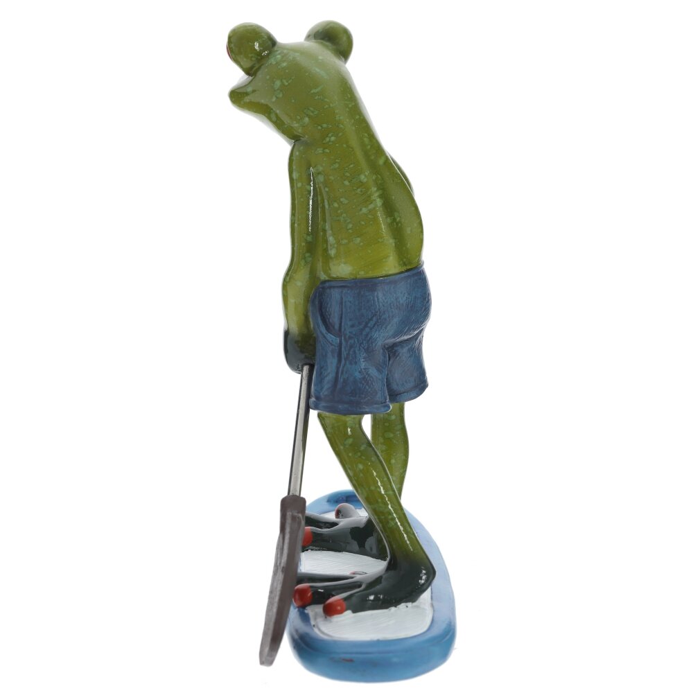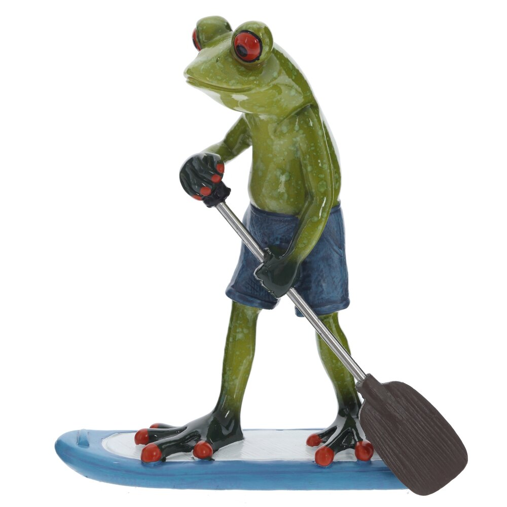 Перед вами декоративная фигурка, выполненная из полимерных материалов, изображающая забавную лягушку, катающуюся на доске с веслом. Лягушка выглядит очень оригинально и дружелюбно благодаря своей позе и ярко выраженным красным глазам. Она одета в синие шорты, что придаёт изделию особый шарм и подчёркивает летнее, беззаботное настроение. Фигурка окрашена в насыщенные зелёные и синие оттенки, детали отчётливо прорисованы, а поверхность имеет легкий глянец. Такой сувенир отлично подойдёт для украшения интерьера, добавив ему нотки юмора и уюта. Идеально впишется в коллекцию любителей необычных фигурок, станет хорошим подарком для друзей и точно поднимет настроение своим видом.