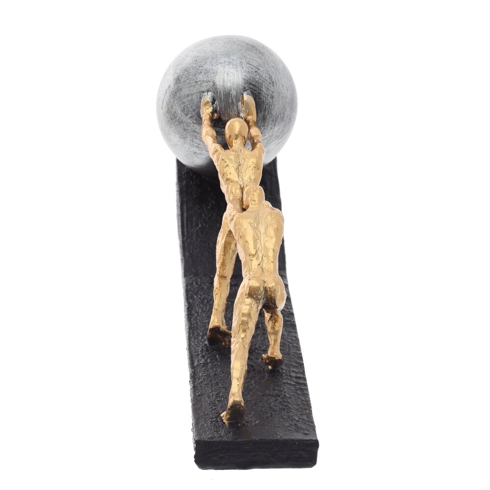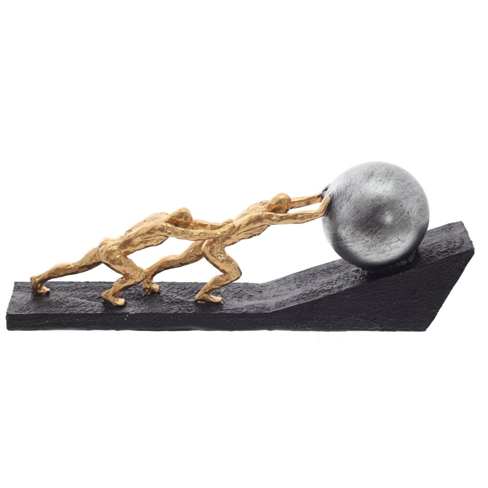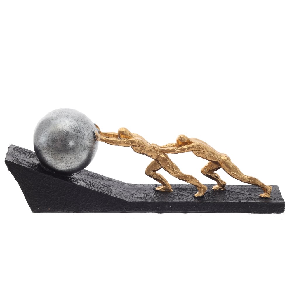 Эта декоративная фигурка выполнена из полимерных материалов и представляет собой стильную композицию, символизирующую упорство, командную работу и преодоление трудностей. Два золотистых силуэта людей напряжённо толкают массивный металлический шар вверх по наклонной поверхности, что делает изделие не только эстетически привлекательным, но и несущим глубокий смысл. Черное основание с текстурированной поверхностью придает дополнительную выразительность и устойчивость. Фигурка станет отличным элементом декора для офиса, кабинета или гостиной, а также может послужить вдохновляющим подарком для тех, кто ценит мотивацию и стремление к успеху.