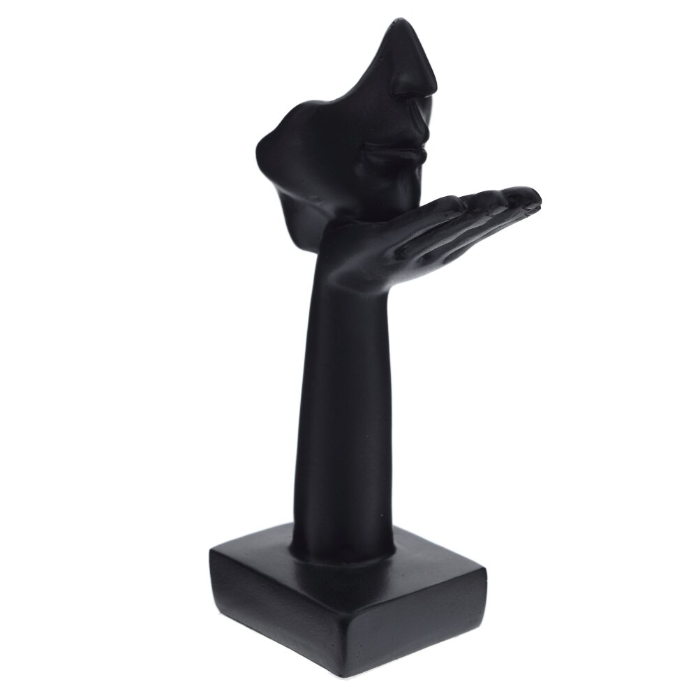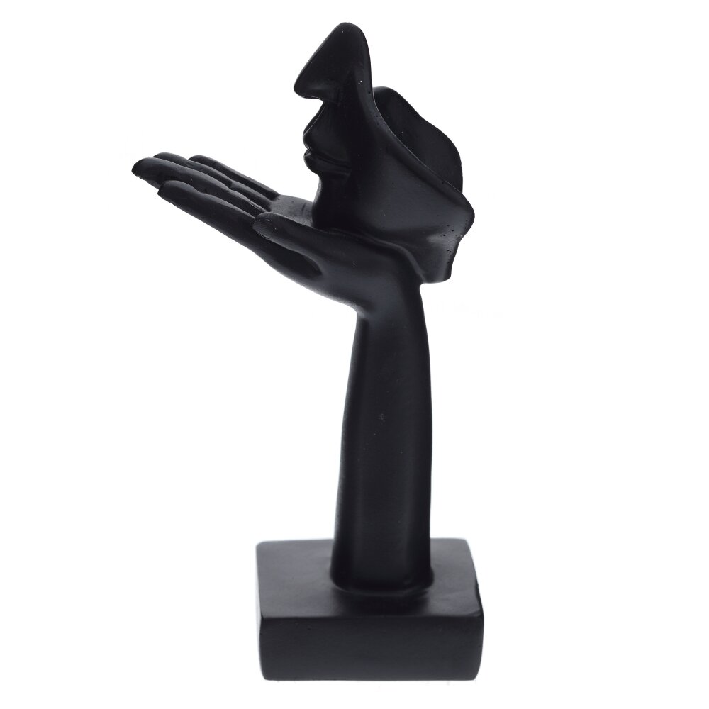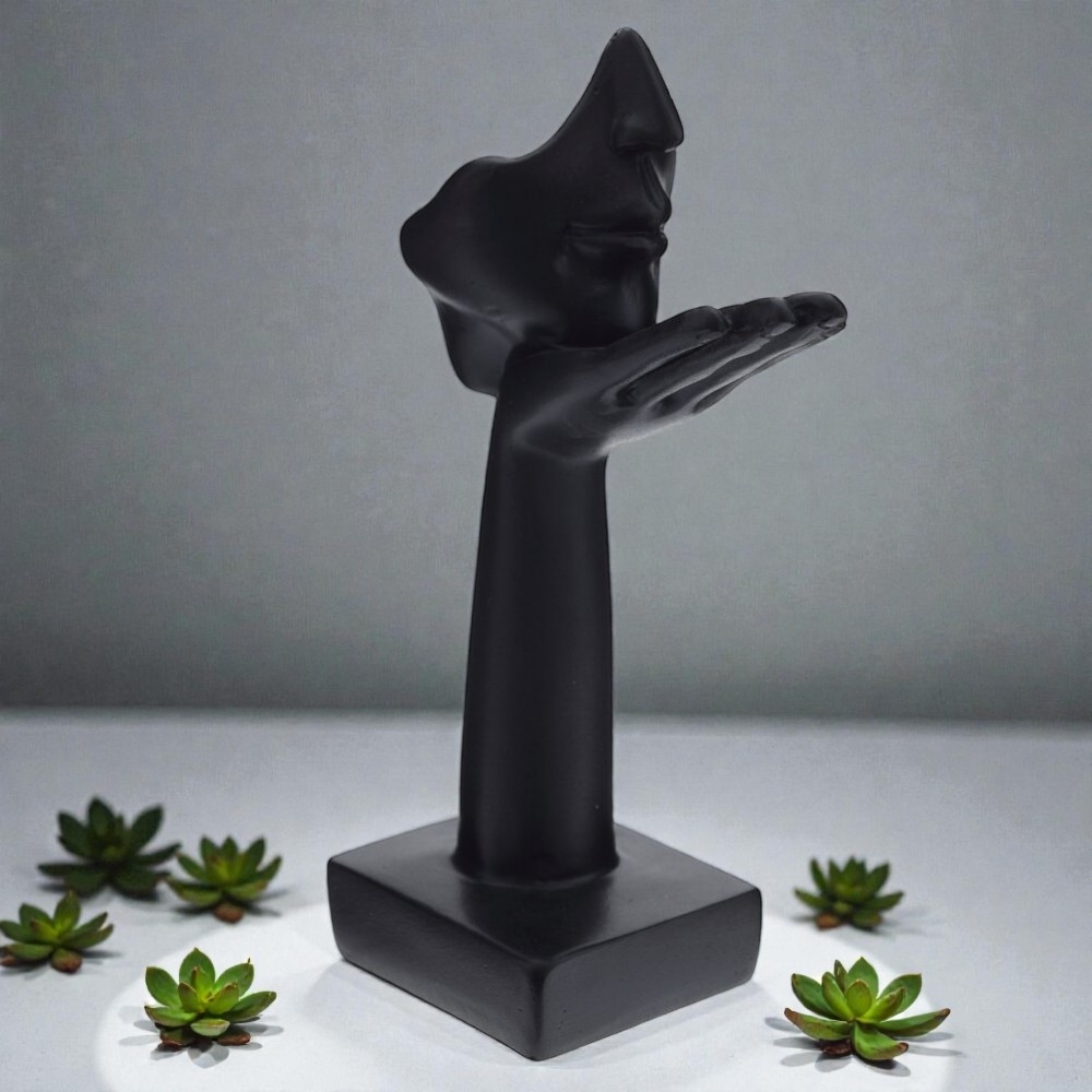 Декоративная фигурка из полимерных материалов в современном минималистичном стиле. Композиция построена на контрасте плавных линий: вытянутая рука с приподнятой ладонью поддерживает абстрактный фрагмент лица с четким профилем, носом и губами. Матовый черный цвет подчеркивает скульптурную пластику и красиво поглощает свет. Компактная, но устойчивая благодаря квадратному основанию, она легко станет акцентом на полке, комоде, журнальном столике или в рабочем кабинете. Уместна в интерьерах лофт, модерн, минимализм и сканди. Символизирует вдохновение, тайну и деликатный жест внимания, поэтому отлично подойдет в качестве оригинального подарка. Уход прост: достаточно протирать сухой мягкой салфеткой.