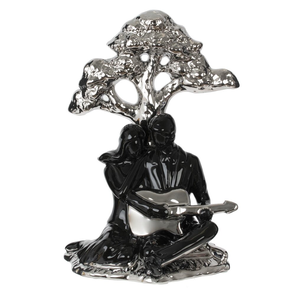 Декоративная фигурка «Влюблённая пара под деревом» – изящный акцент для современного интерьера. Композиция изображает сидящую на земле пару, укрывшуюся в тени раскидистого дерева: мужчина держит гитару, женщина нежно прижимается к его плечу. Глянцевая поверхность в сочетании чёрного и серебристого тонов создаёт эффект металла и красиво отражает свет, подчёркивая плавные линии силуэта. Фигурка станет стильным украшением гостиной, спальни или романтического уголка, гармонично впишется в интерьер в стиле модерн, лофт или арт-деко. Идеальный вариант подарка на свадьбу, годовщину, День всех влюблённых или просто как знак внимания близкому человеку, символизирующий любовь, гармонию и душевное тепло.