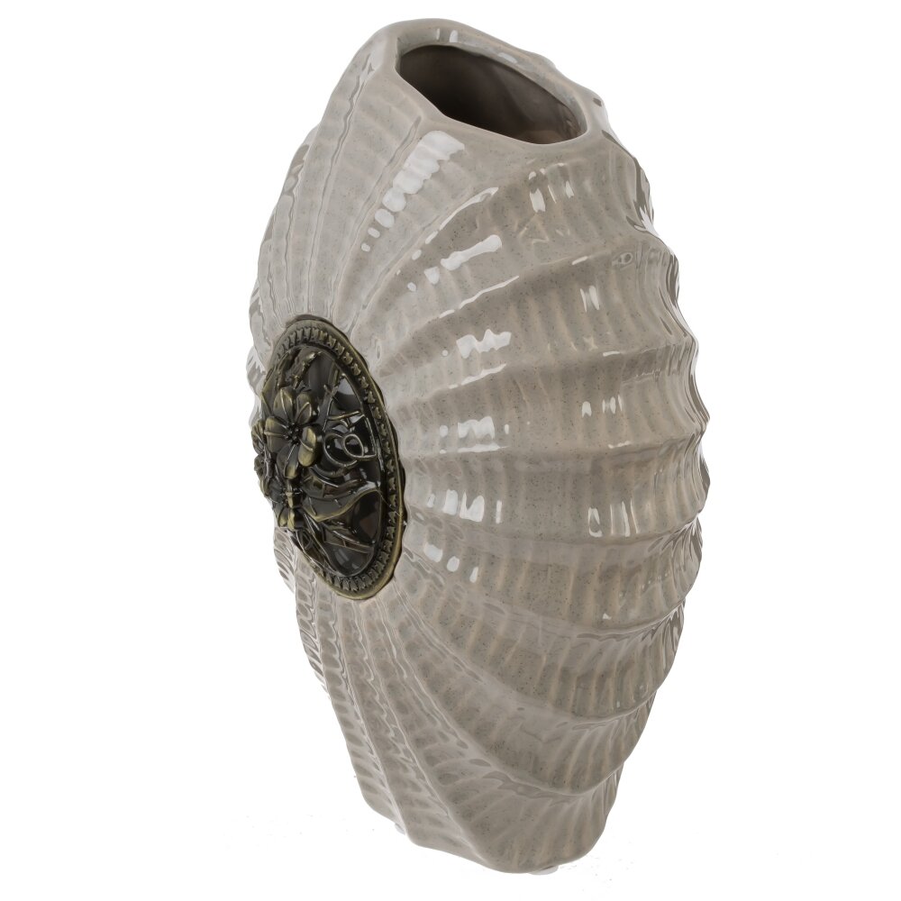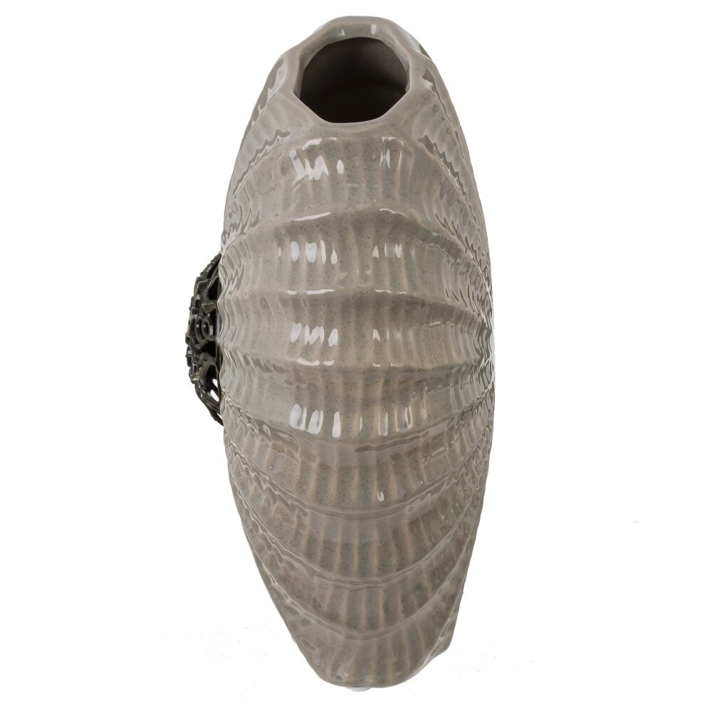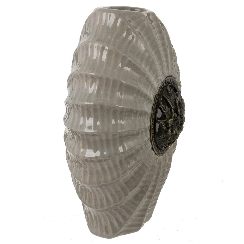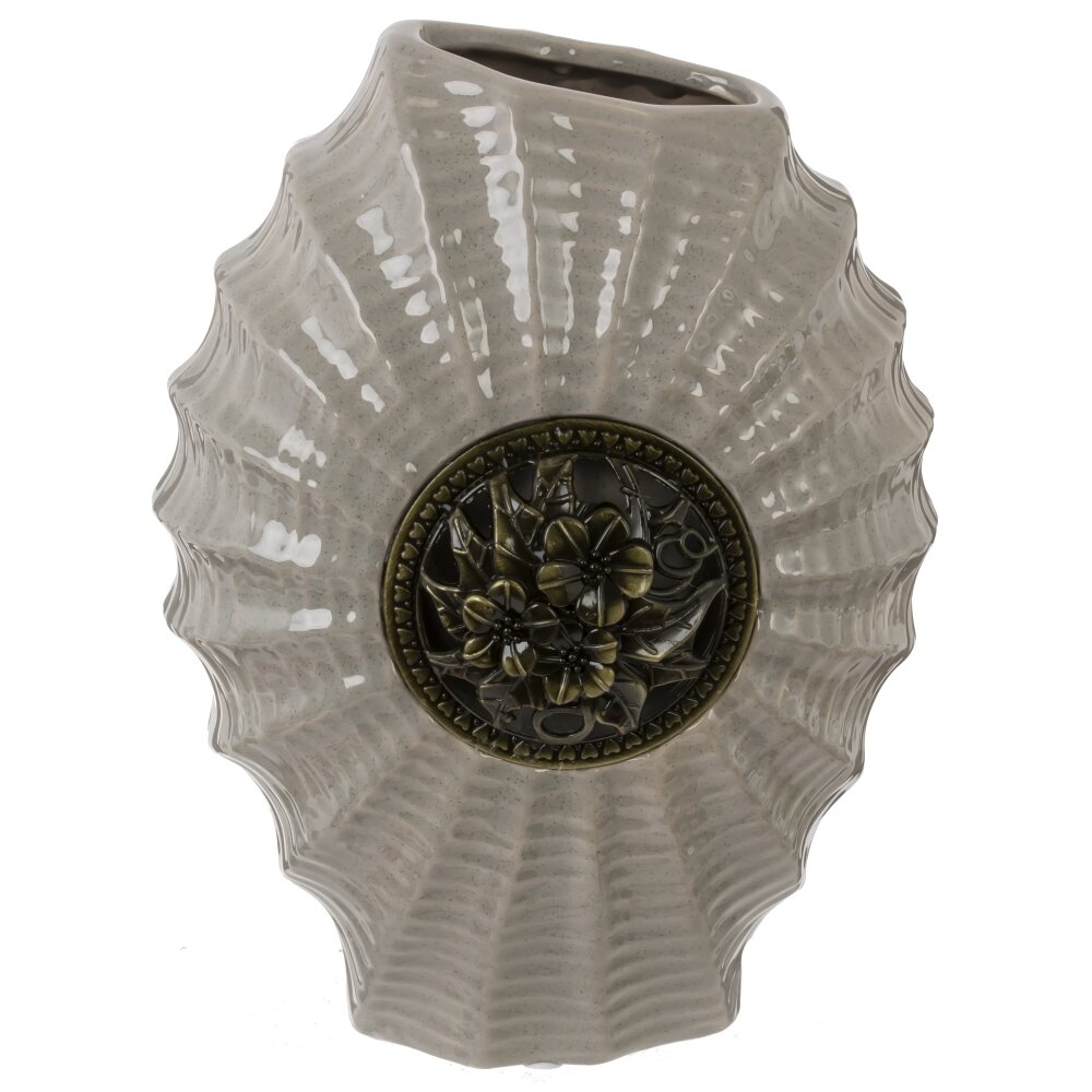 Ваза объемом 1750 мл выполнена из фарфора с декоративным элементом из металла. Её необычная форма с волнистыми рифлениями напоминает морскую раковину, что придаёт изделию оригинальный и стильный вид. Основной оттенок вазы — спокойный светло-серый, который гармонично сочетается с металлическим декором в виде цветочного орнамента, размещённого по центру. Такая ваза станет гармоничным дополнением как для современного, так и для классического интерьера, добавит изысканности комнате и может использоваться как самостоятельный декоративный объект или для композиций из живых или сухих цветов. Изделие подчёркивает утончённый вкус хозяев и прекрасно подходит для украшения гостиной, спальни или офиса. Фарфоровая основа обеспечивает прочность и долговечность, а металлические детали добавляют изделию уникальности и выразительности. Размер горловины: 7*4 см.