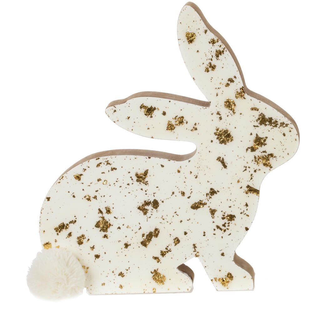 -Декоративная пасхальная фигурка в виде зайчика, выполненная из гладко отполированного дерева. Поверхность окрашена в нежный молочно-белый цвет и украшена россыпью золотистых «потертостей», создающих эффект благородного свечения. Объёмный мягкий хвостик-помпон добавляет композиции игривости и уюта. Фигурка устойчиво стоит на ровной поверхности, отлично подходит для оформления пасхального стола, каминной полки, подоконника или детской комнаты. Стильный акцент для современного интерьера и приятный подарок к Пасхе.