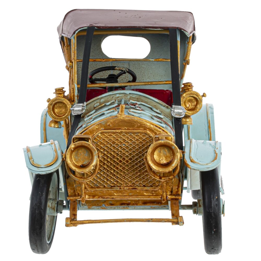 Декоративное изделие «Автомобиль» – изящная металлическая модель в стиле ретро, выполненная с тщательной проработкой деталей. Мягкий голубой цвет кузова сочетается с золотистыми элементами и бордовой складной крышей, создавая атмосферу начала ХХ века. Видны фары, ступеньки, рулевое управление, запасное колесо и другие реалистичные акценты. Такая фигура станет эффектным украшением гостиной, кабинета или витрины, подчеркнёт вкус владельца и станет оригинальным подарком коллекционерам и любителям винтажных автомобилей.