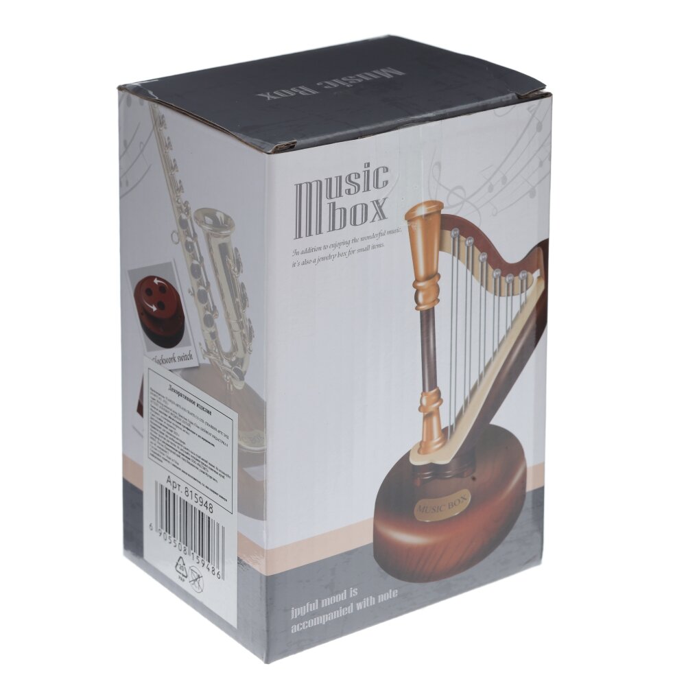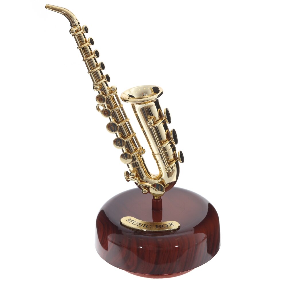 Декоративное изделие «Саксофон» — изящная настольная музыкальная фигурка. Миниатюрный саксофон  золотого цвета  установлен на округлом глянцевом основании с отделкой под дерево и табличкой Music Box. В основание встроен заводной ключ: достаточно повернуть его — и механизм начинает работу. Плавно вращается основание, а пространство наполняет мягкая мелодия без использования батареек. Аксессуар создаёт атмосферу классической музыки, станет украшением гостиной, кабинета, музыкального класса или витрины. Отличная идея подарка преподавателю, меломану и ценителю стильных сувениров; компактно смотрится, привносит уют и умиротворение.