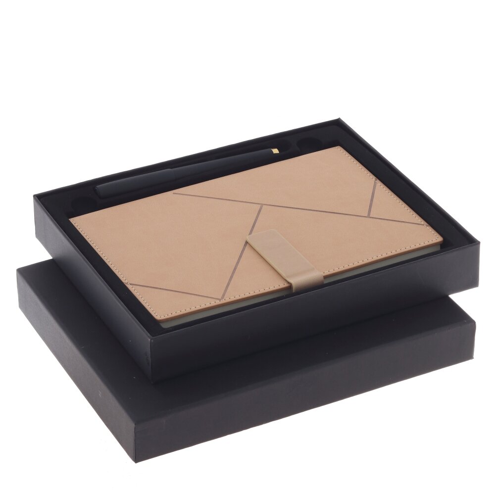 Элегантный набор, состоящий из блокнота и ручки, аккуратно размещённых в подарочной коробке строгого чёрного цвета. Блокнот изготовлен из высококачественной бумаги с стильной обложкой из полимерного материала и элементом на магните для фиксации. Ручка также выполнена с применением полимеров, плавно сочетается с оформлением и декорирована металлическими вставками. Такой комплект станет отличным подарком для деловых людей, студентов или творческих личностей, подойдёт для заметок, планирования или записи идей. Стильная упаковка добавляет набору презентабельности и подчеркивает его статус.