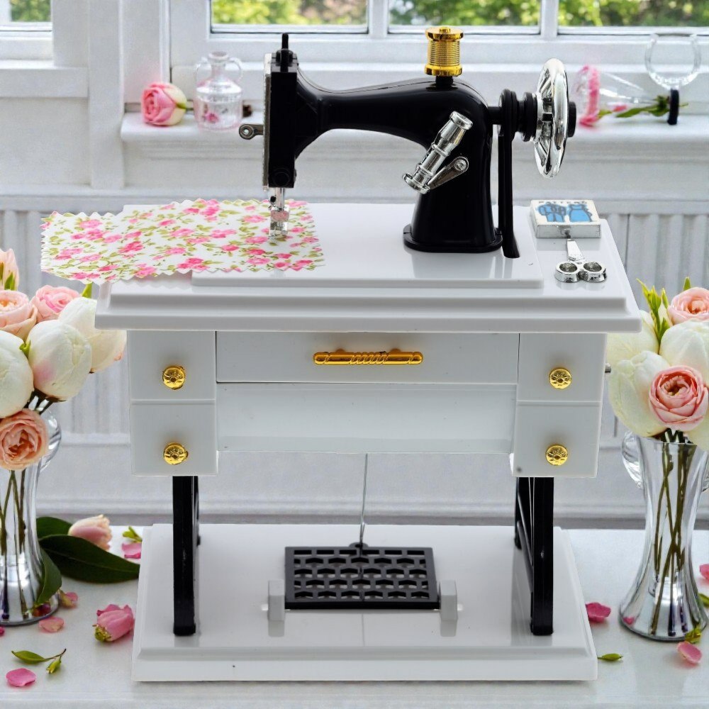Декоративная миниатюра «Швейная машинка» — музыкальное интерьерное изделие в винтажном стиле. На белой тумбе расположена черная машинка с узорной фронтальной панелью, блестящим маховиком и ножной педалью; на столешнице лежит лоскут цветочной ткани. Золотистая фурнитура подчеркивает изящество модели. Изделие оснащено заводным ключом: заведите механизм и откройте выдвижной ящик — зазвучит нежная мелодия, а колесо и игла начнут плавно имитировать работу. Такая музыкальная миниатюра добавит уюта в гостиную, мастерскую или детскую, станет оригинальным подарком для любителей шитья и коллекционеров необычных аксессуаров.