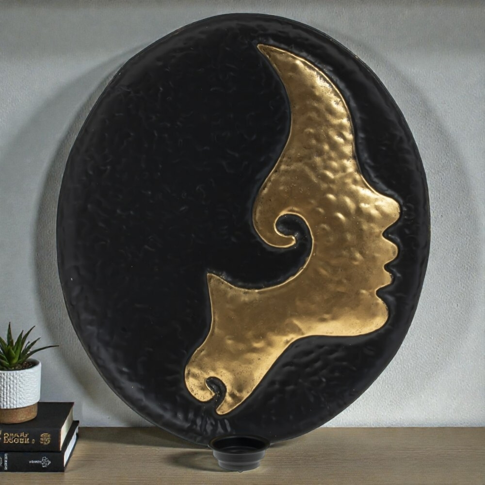 Оригинальное металлическое панно с изображением девушки золотого цвета. Изделие имеет подсвечник, который поможет создать мягкий и приятный свет от свечи. Это панно станет идеальным решением для тех, кто желает украсить свой дом чем то оригинальным.