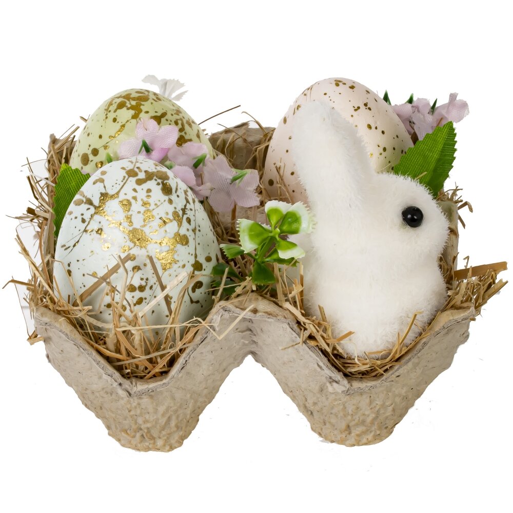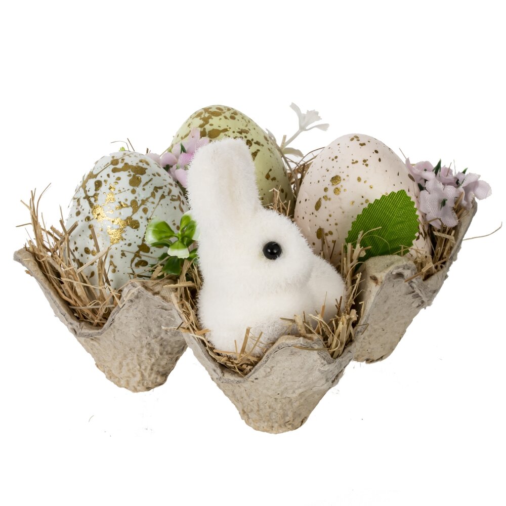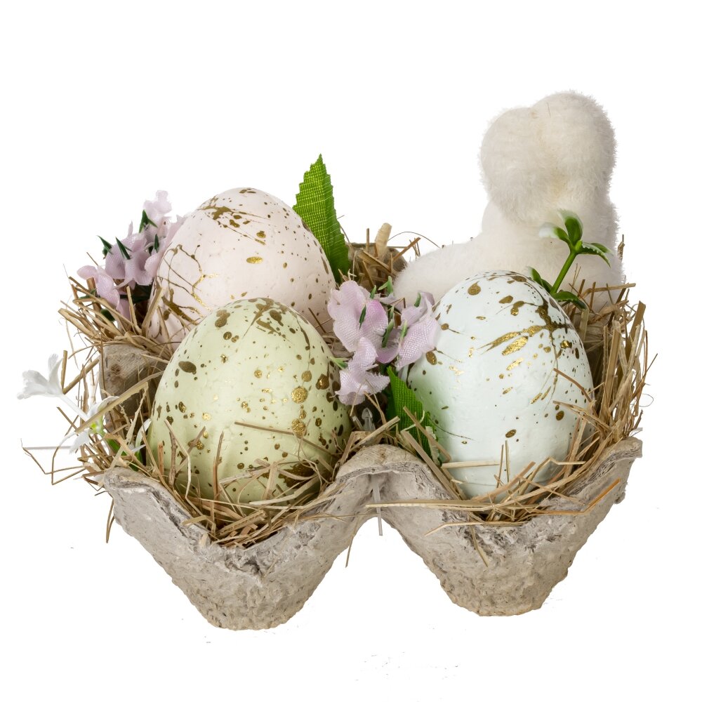 Декоративное изделие "Пасхальная композиция" станет прекрасным украшением дома или праздничного стола. Композиция выполнена из полимерных и натуральных материалов, сочетая искусственные яйца с золотыми вкраплениями, фигурку пушистого белого кролика и декоративные элементы, такие как солома, искусственные цветы и зелень. Декор помещен в стильную картонную подставку, имитирующую упаковку для яиц, что придает композиции естественный и уютный вид. Такой пасхальный декор создаст весеннее настроение и подчеркнет атмосферу светлого праздника. Он прекрасно подойдет как элемент сервировки праздничного стола или как подарок близким.