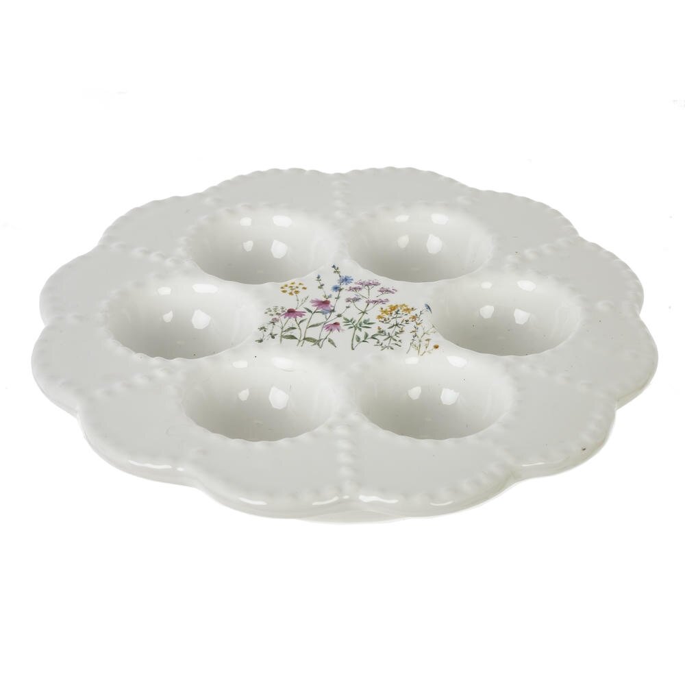 Элегантная пасхальная тарелка для 6-ти яиц из качественной керамики станет украшением праздничного стола. Круглая форма с волнистым краем и рельефным декором придает изделию изысканный вид, а в центре расположён нежный рисунок полевых цветов, создающий весеннее настроение. Глубокие ячейки надежно фиксируют окрашенные яйца или фаршированные закуски, предотвращая их скатывание. Гладкая глазурованная поверхность легко моется и устойчива к появлению пятен. Такая тарелка отлично подойдёт для сервировки на Пасху, семейных завтраков и торжественных ужинов, а также станет приятным и практичным подарком к светлому празднику.