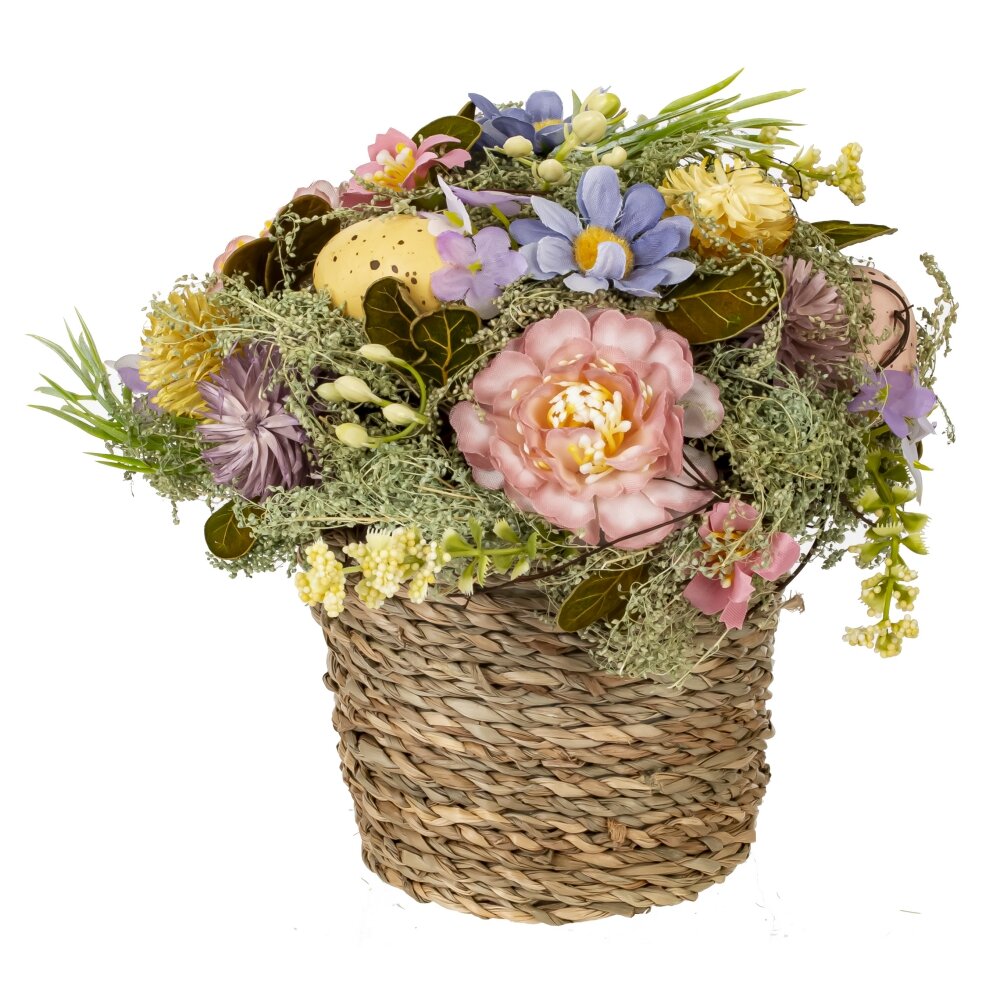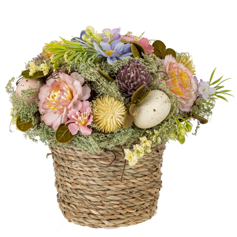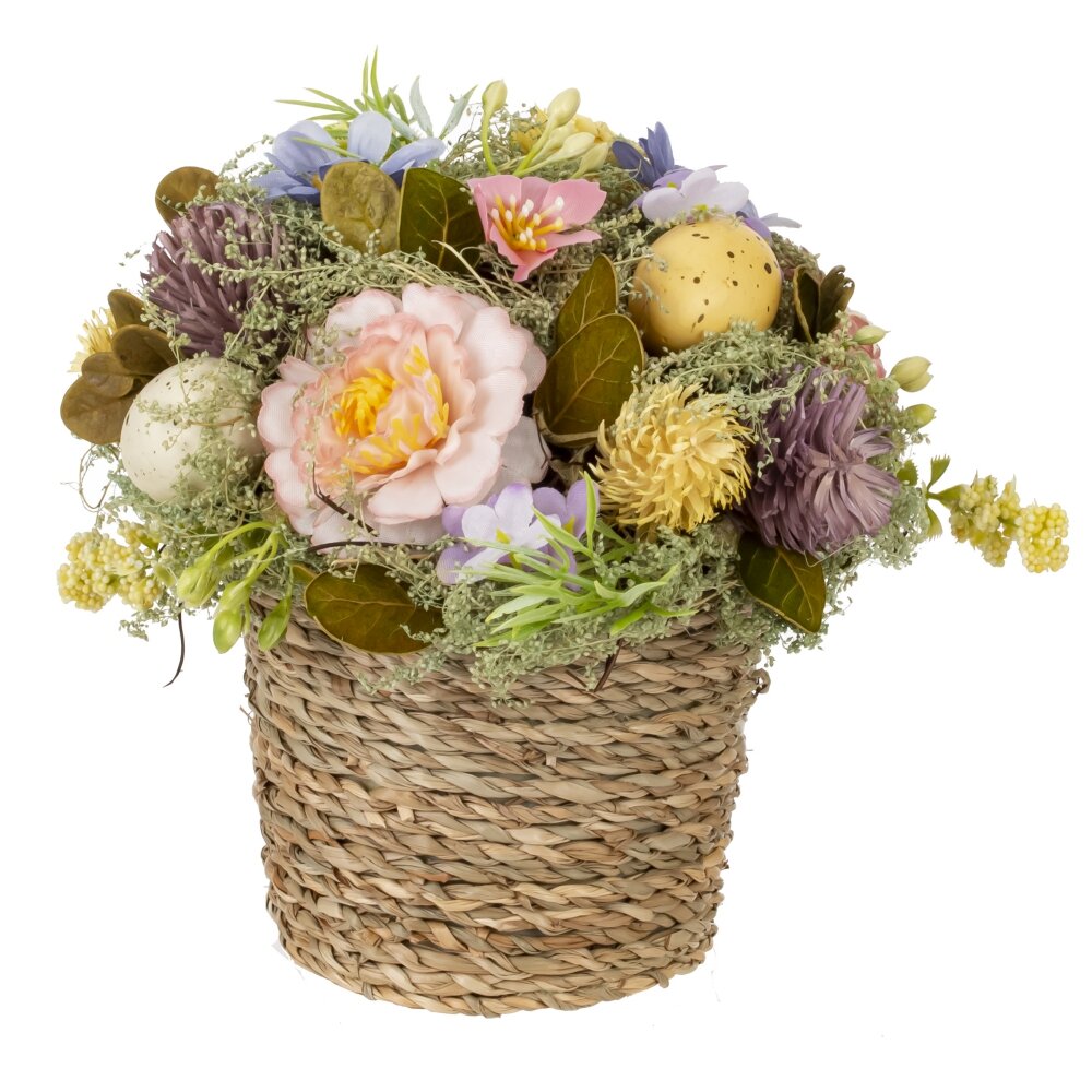 Эта пасхальная композиция выполнена с использованием как натуральных, так и полимерных материалов, создавая праздничное настроение и уют в доме. В плетеной корзине из природного материала расположены декоративные элементы, символизирующие весну и Пасху. Изящные искусственные цветы, выполненные из полимерных материалов, реалистично передают структуру лепестков и нежность натуральных растений. Они дополнены зелеными веточками и мхом, который придает композиции естественность и свежесть. Главный акцент сделан на декоративные яйца, окрашенные в мягкие пастельные оттенки и украшенные мелкими крапинами, что придает им натуральный эффект. Эти элементы символизируют обновление, радость и пробуждение природы. Разнообразие цветов, включая розовые, желтые, голубые и фиолетовые оттенки, делает эту композицию нежной и весенней. Благодаря сочетанию натуральных материалов, таких как плетеная корзина и сухие растения, и искусственных цветов, композиция остается долговечной и может служить украшением интерьера на долгие годы. Она станет прекрасным дополнением к праздничному столу, украшая его теплом и Пасхальной радостью.