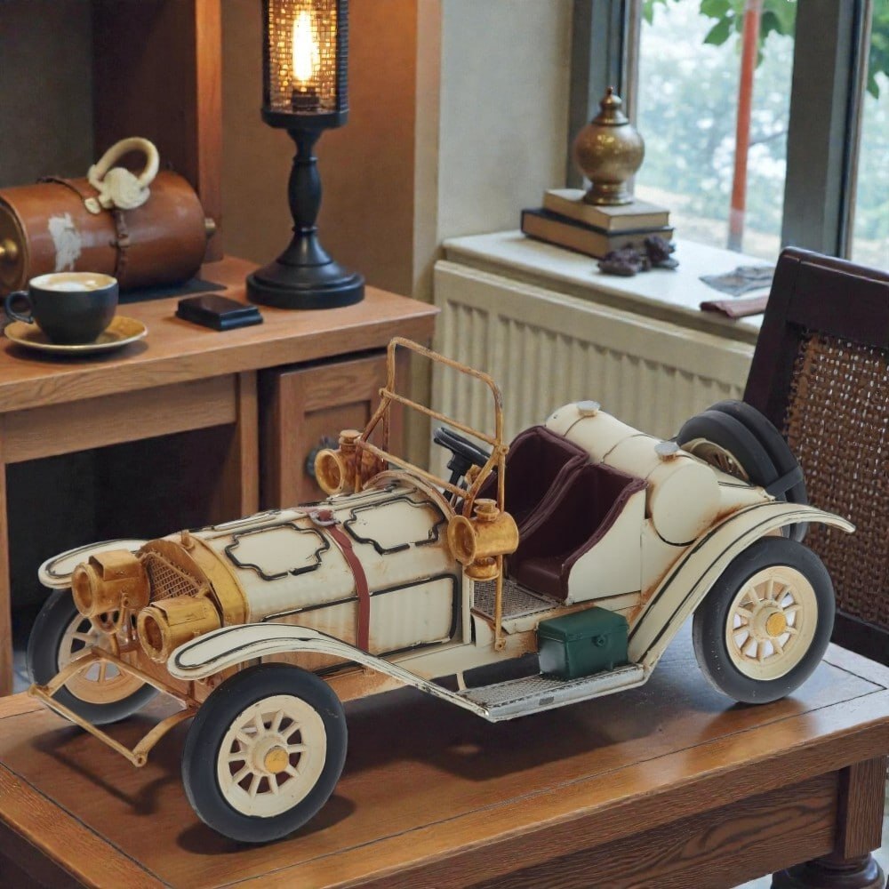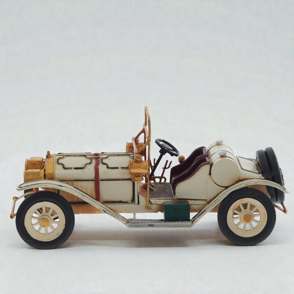 Декоративное изделие «Автомобиль» – изящная металлическая миниатюра в ретро-стиле, созданная для ценителей винтажных акцентов в интерьере. Модель детально проработана: открытый салон с двумя сиденьями, спицы на колесах, рулевое колесо, багажный отсек и имитация крепежей на кузове. Слегка состаренное покрытие с эффектом потертостей придаёт изделию шарм антикварной вещи, а сочетание светлого металла с золотистыми элементами делает его заметным интерьерным акцентом. Такой автомобиль отлично впишется в кабинет, гостиную или комнату подростка, добавив пространству характер и индивидуальность. Идеален как оригинальный подарок автолюбителю, коллеге или другу, увлекающемуся историей техники и необычными предметами декора.