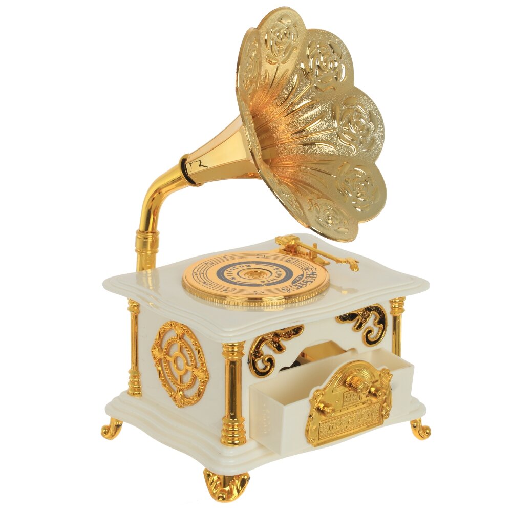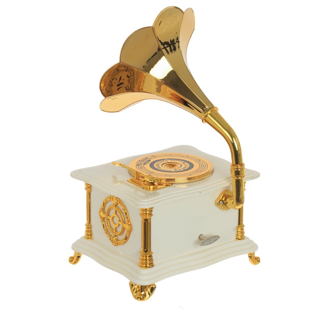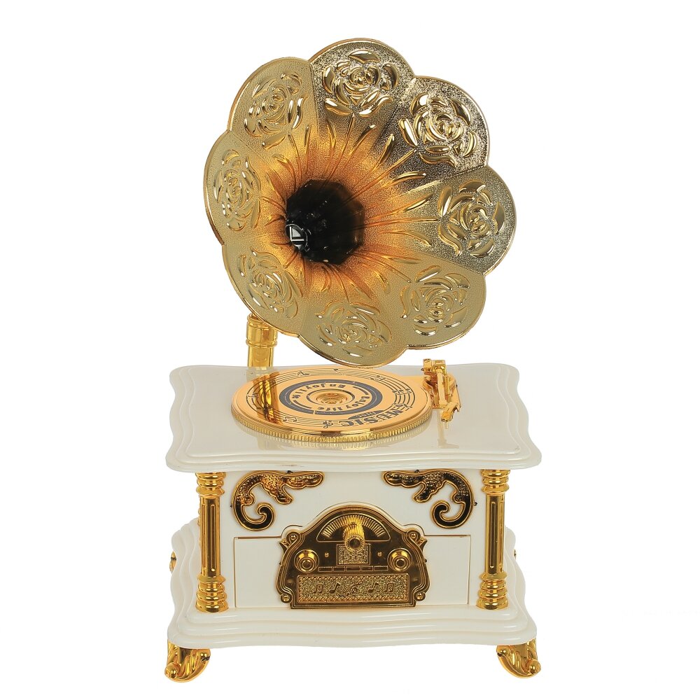 Элегантное декоративное изделие «Граммофон» — музыкальная миниатюра в стиле ретро. Корпус цвета слоновой кости на фигурных ножках украшен позолоченными колонками и накладками, а широкий рупор с рельефными розами подчеркивает винтажный характер. На крышке — имитация пластинки и тонарм. Заводной ключ. Открывается ящик — крутится пластинка, играет музыка, создавая уютную атмосферу и эффект настоящего граммофона. Ящичек можно использовать для мелочей и памятных вещиц. Модель станет выразительным акцентом в интерьере, романтичным подарком, предметом коллекции и напоминанием о классике звука.