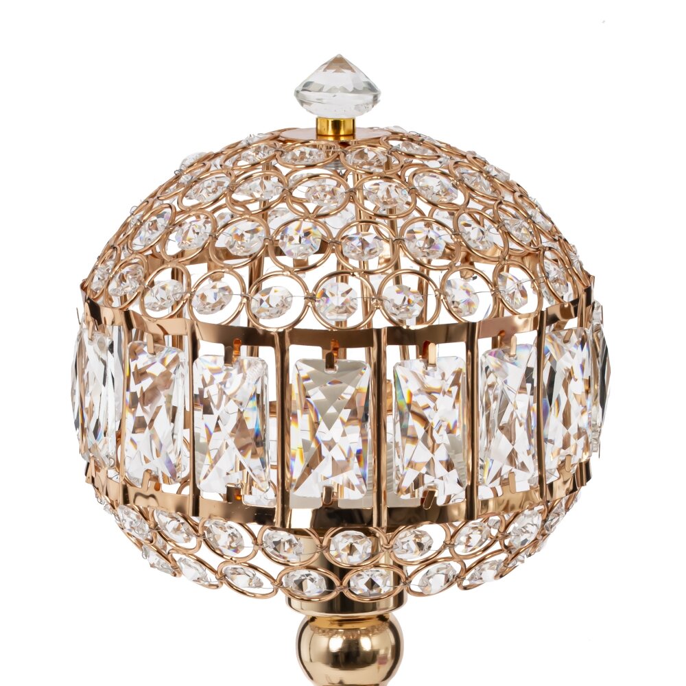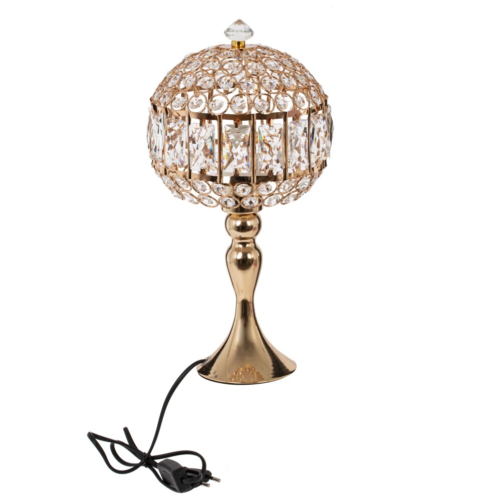 Элегантный светильник настоящим украшением интерьера. Основание выполнено из качественного металла с золотистым покрытием, что придаёт изделию роскошный вид. Абажур с цоколем E27 состоит из металлического каркаса, украшенного стеклянными вставками, которые красиво преломляют свет, создавая в комнате уютную атмосферу. Длина шнура составляет 1,05 м, что позволяет удобно разместить светильник на столе, тумбе или комоде. Этот декоративный осветительный прибор прекрасно подойдет для классического и современного стиля, добавляя помещении нотки изысканности и утонченности.