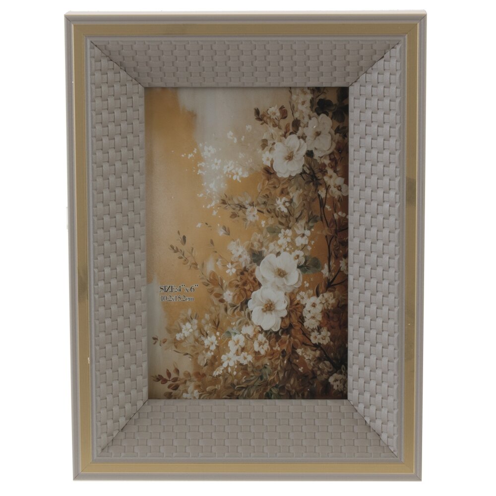 Элегантная фоторамка для фотографии формата 10?15 см. Основа выполнена из прочных полимерных материалов, лицевая часть — из прозрачного стекла, которое надежно защищает снимок от пыли, отпечатков и случайных царапин. Рамка оформлена в спокойном бежево-сером оттенке с выразительной фактурой под плетение и тонкой золотистой окантовкой по периметру, благодаря чему выглядит аккуратно и благородно. Скосы углов подчеркивают глубину, создавая эффект паспарту и красиво фокусируя внимание на изображении. Нейтральная цветовая гамма легко сочетается с классическим и современным интерьером — от гостиной и спальни до кабинета. Идеальна для семейных фотографий, детских портретов или памятных открыток, станет приятным и практичным подарком.