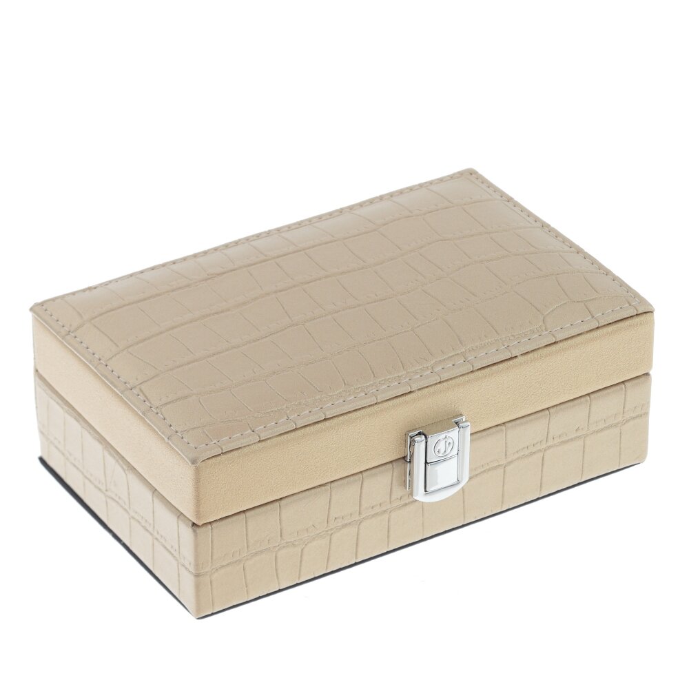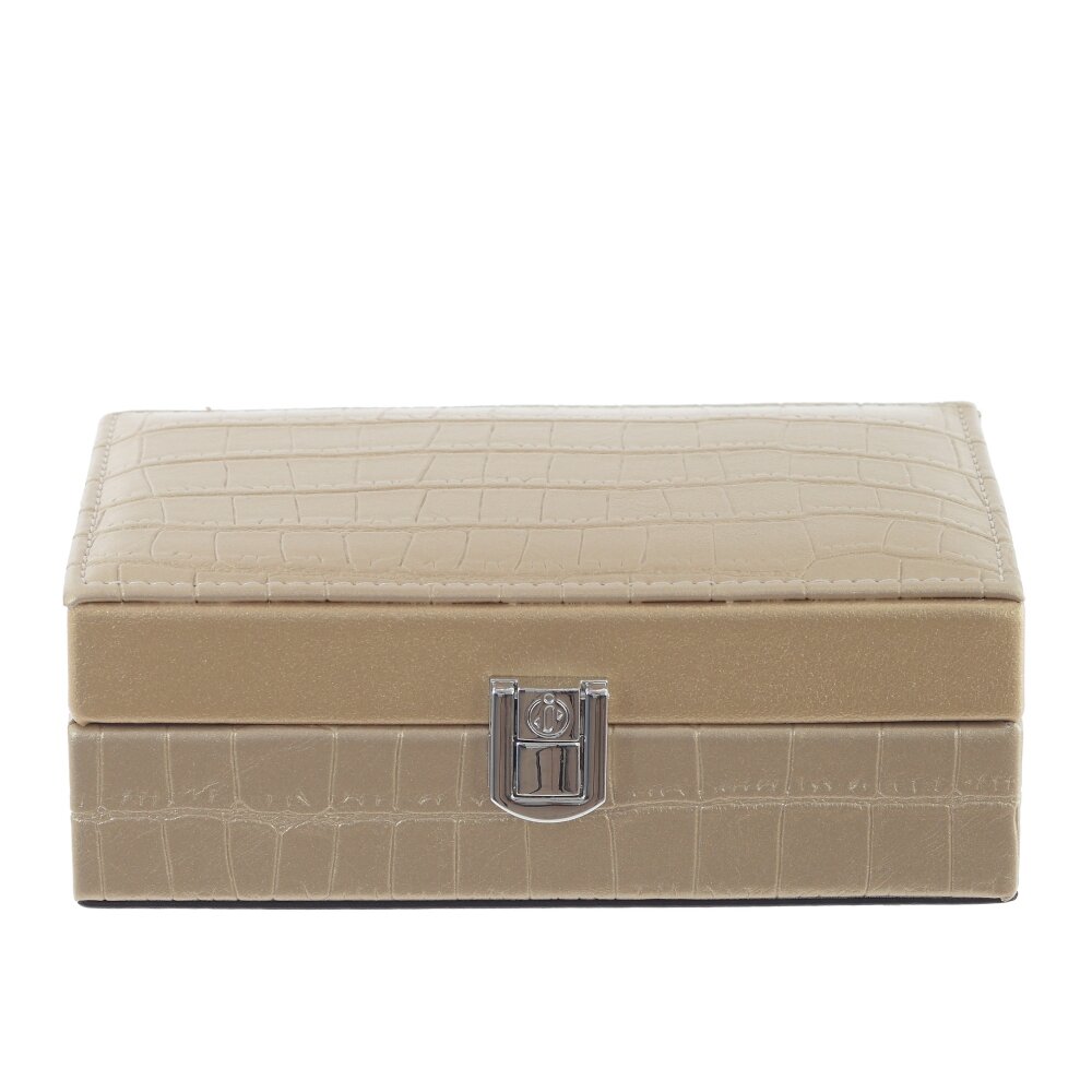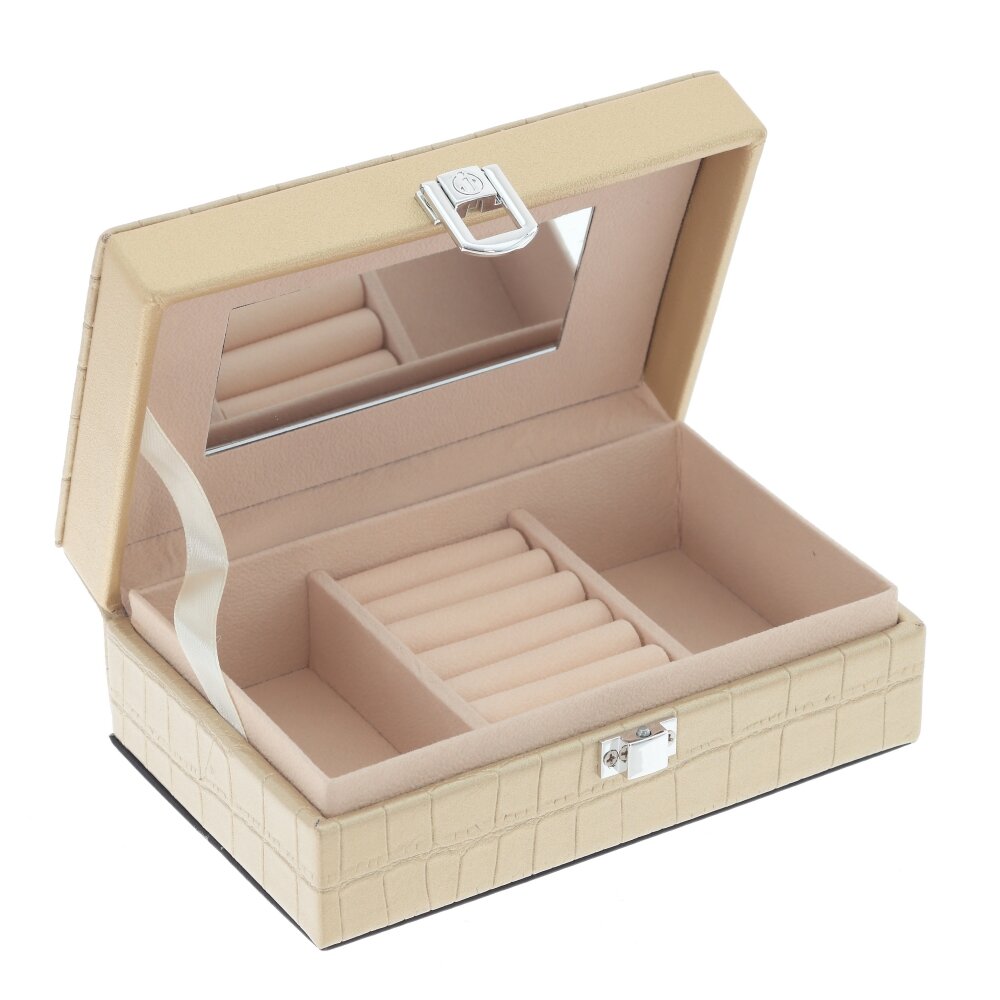 Элегантная шкатулка для украшений в бежевом цвете – стильное решение для хранения ваших драгоценностей. Внешняя отделка выполнена под кожу с тиснением «под крокодила», что придаёт изделию благородный и современный вид. Внутри мягкая бархатистая подкладка нежного персикового оттенка бережно защищает украшения от царапин. Предусмотрен блок с валиками для колец и серёг, а также несколько отделений для браслетов, цепочек и брошек. На внутренней стороне крышки расположен удобный прямоугольный зеркальце для примерки украшений. Надёжный металлический замочек фиксирует шкатулку в закрытом положении, делая её удобной как для дома, так и для путешествий. Такая шкатулка станет удачным подарком и гармонично впишется в любой интерьер спальни или гардеробной.