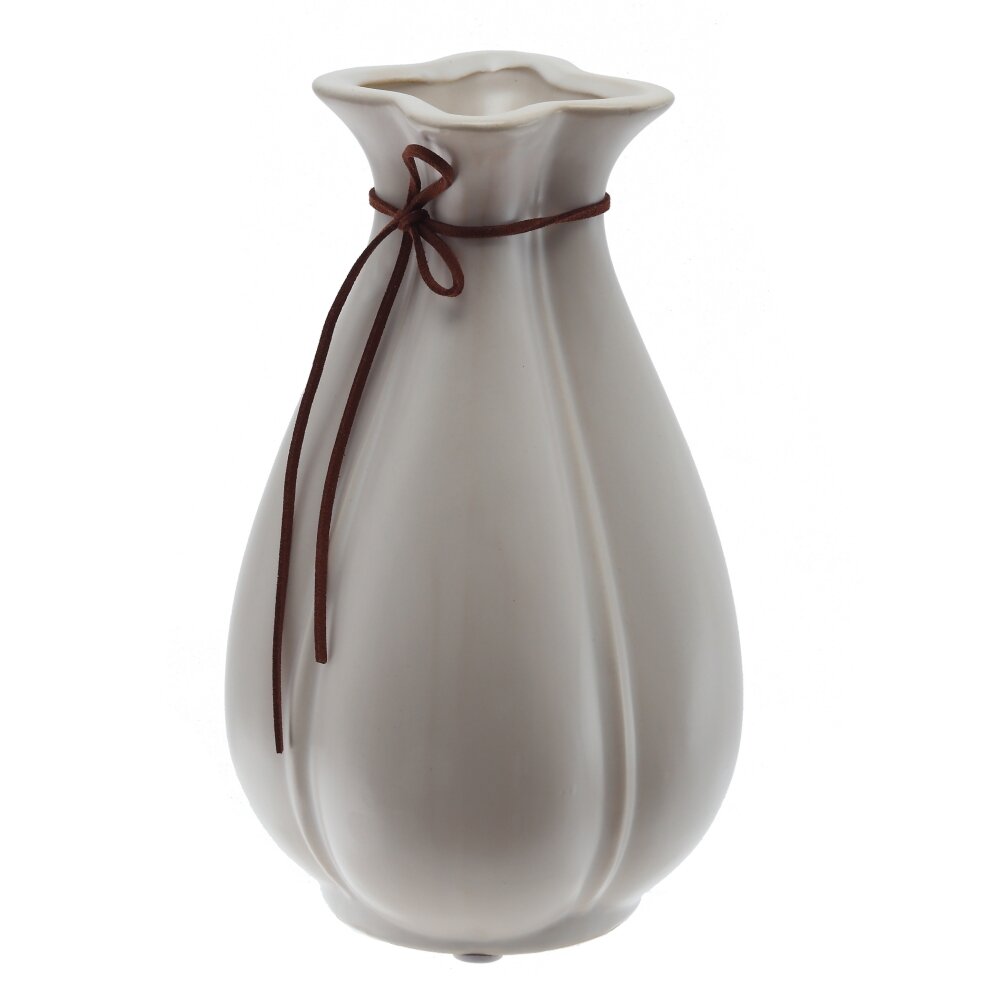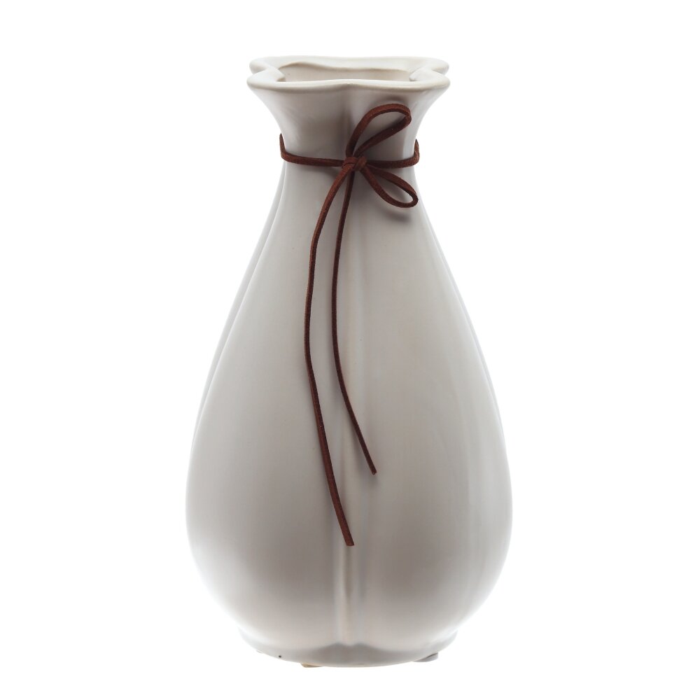 Элегантная ваза объемом 1000 мл изготовлена из высококачественного фарфора, что придает ей особую изысканность и прочность. Ее плавные линии и светлый оттенок создают утонченную эстетику, которая удачно впишется в любой интерьер. Нестандартная форма горлышка с декоративной волнистой кромкой придает изделию оригинальный вид, а коричневый шнурок, завязанный в виде банта, добавляет нотку уюта и тепла. Такая ваза станет стильным украшением дома или офиса, а также послужит прекрасным подарком для ценителей изящных предметов декора. Подходит как для свежих, так и для сухоцветов, гармонично сочетается с минималистичным и классическим дизайном. Диаметр горловины: 3 см.