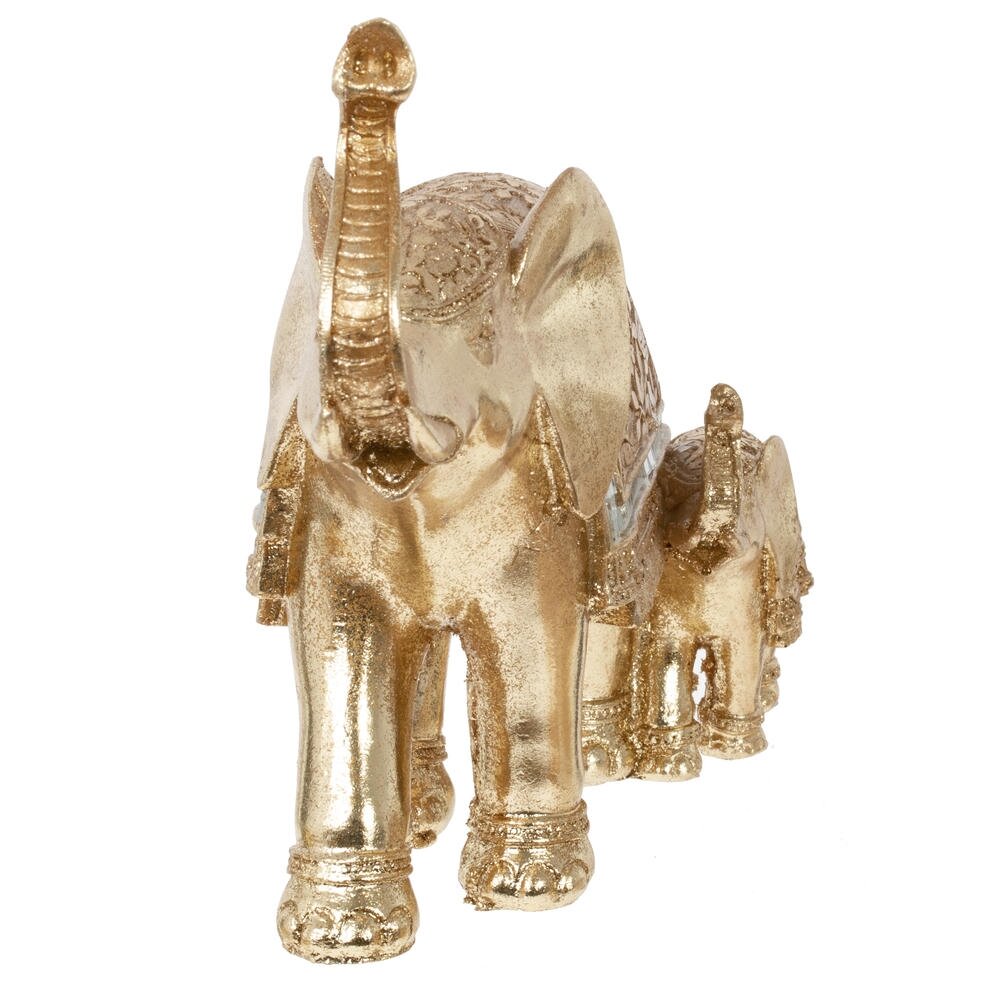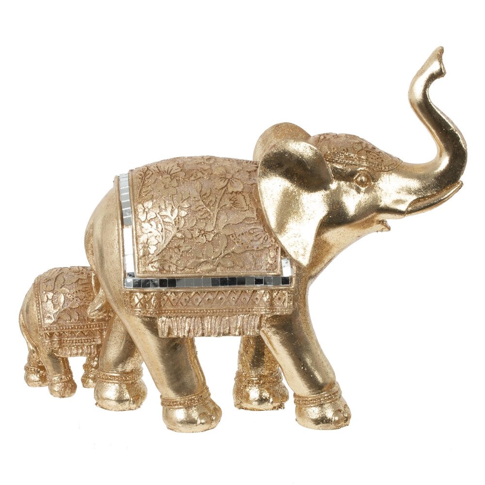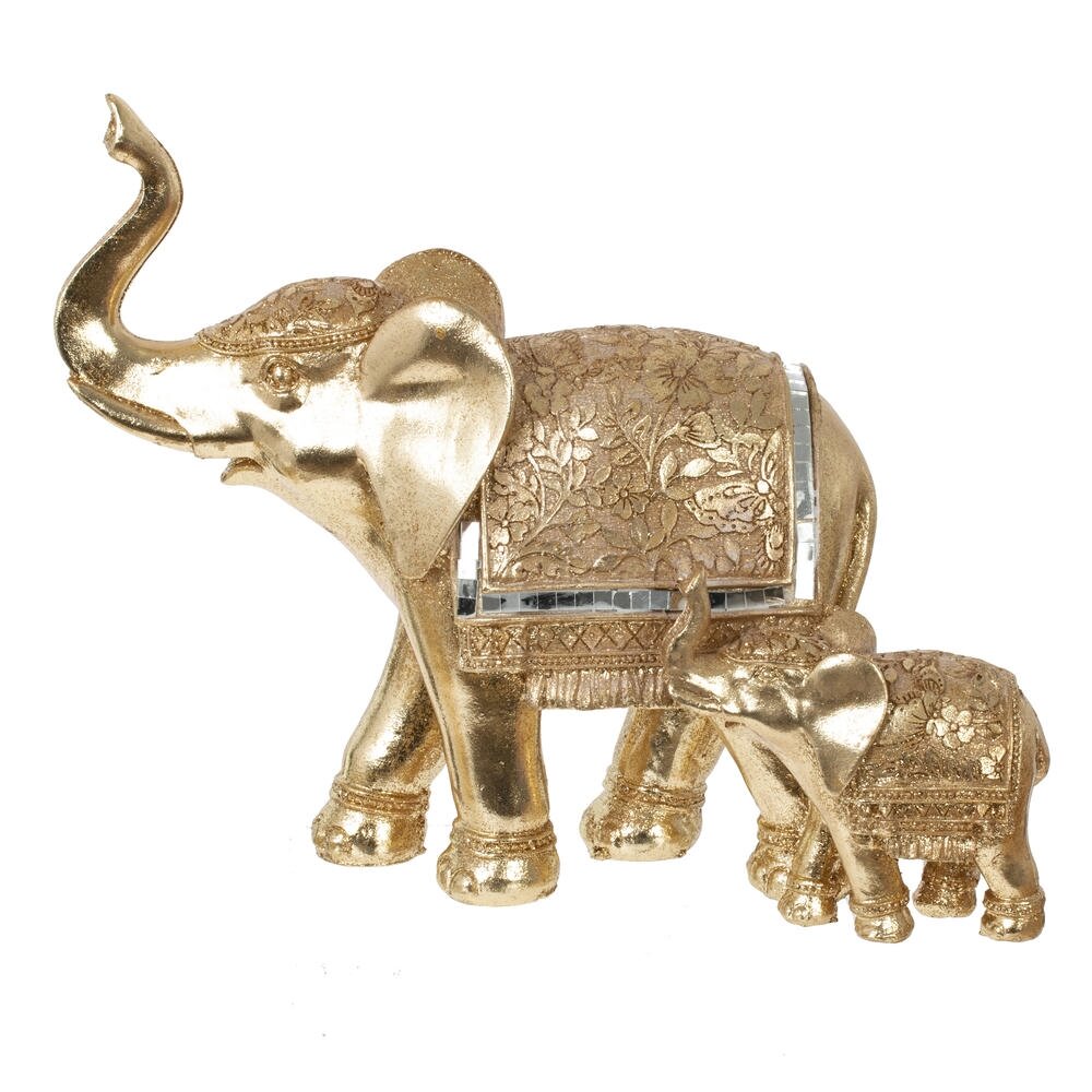 Изысканная декоративная композиция в виде двух слонов - символа мудрости, благополучия и семейного счастья. Фигурка выполнена в благородном золотистом цвете с эффектом состаренного металла. Крупный слон со поднятым хоботом украшен изящной попоной с растительным орнаментом и зеркальными вставками, создающими игру света. Рядом расположился слоненок в такой же стилистике. Идеально впишется в интерьер гостиной, кабинета или прихожей. Станет прекрасным подарком и талисманом для дома.