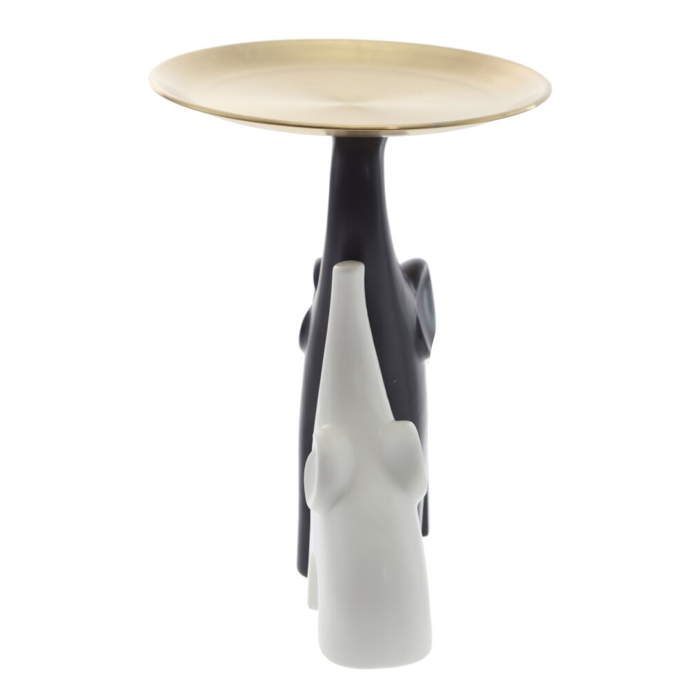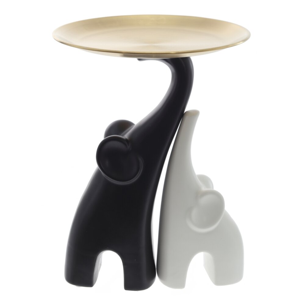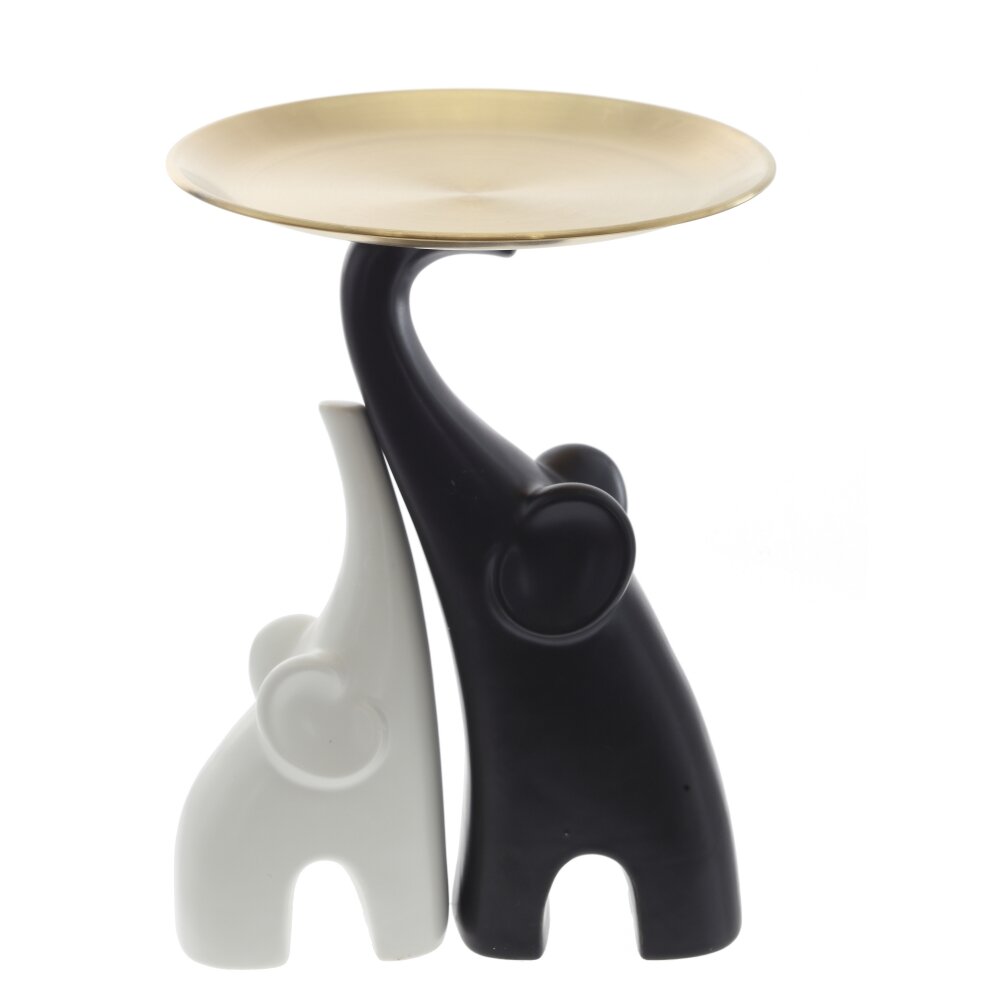 Элегантный набор из двух декоративных фигурок «Слон» с подносом станет стильным украшением интерьера. Фигурки выполнены из керамики в минималистичном дизайне, одна в чёрном, другая в белом цвете, что символизирует гармонию и баланс. Большой слон с поднятым хоботом поддерживает металлический поднос золотистого оттенка, который можно использовать для размещения мелких предметов — ключей, украшений или сладостей. Изящная композиция придаёт пространству уют и изысканность, делая её отличным подарком для любителей декоративных аксессуаров.