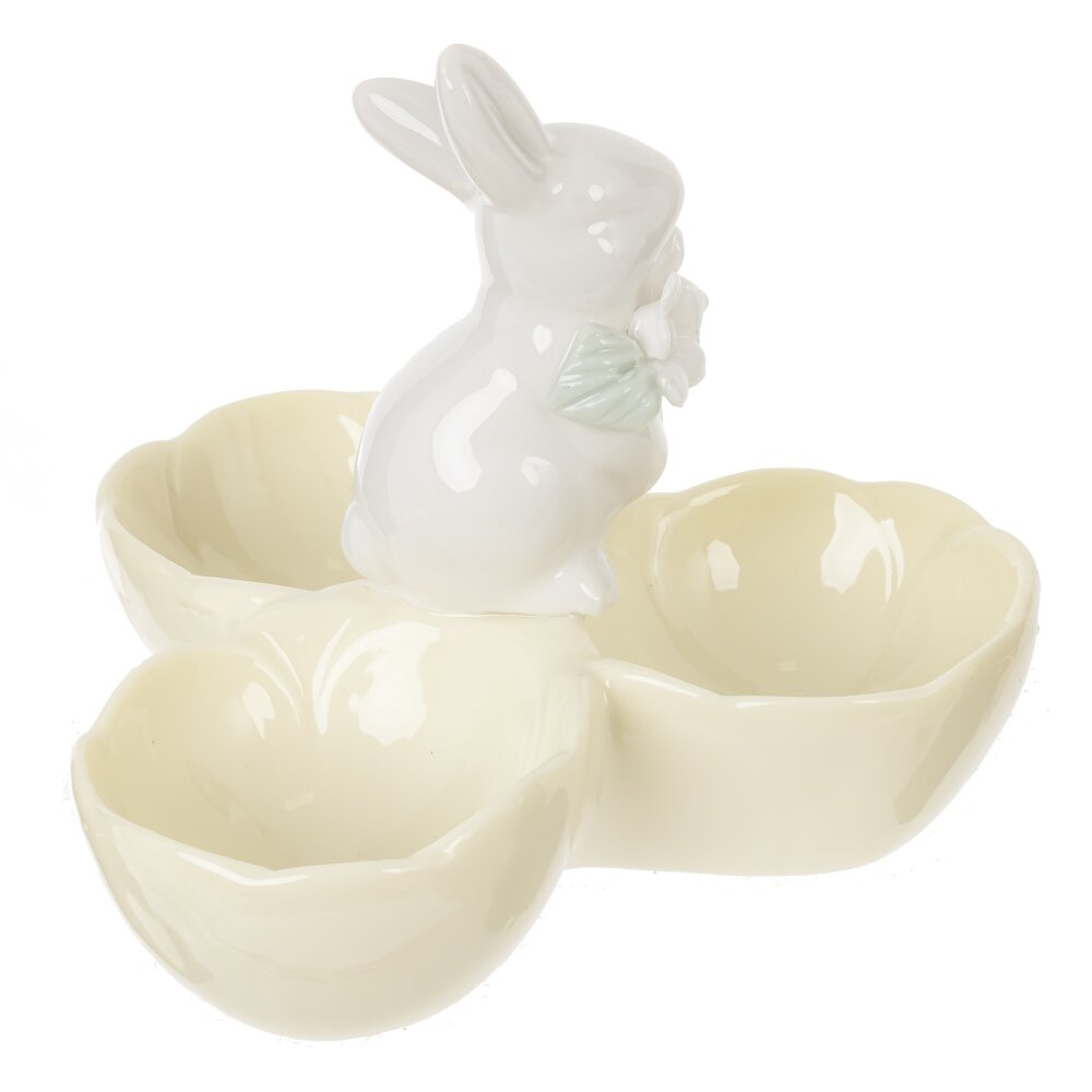 Подставка для яиц — это стильный и функциональный элемент пасхального декора, который добавит яркие акценты на ваш праздничный стол. Изготовленная из фарфора нежно-желтого цвета, она создает атмосферу весеннего тепла и радости. Центральным элементом подставки является изящная фигурка зайца, которая придаёт изделию особый шарм и привлекательность. Подставка рассчитана на три яйца, что делает её идеальной для семейного завтрака или праздничного стола в кругу близких. Этот замечательный аксессуар не только украсит ваш дом, но и станет отличным подарком для друзей и родных в преддверии Пасхи.