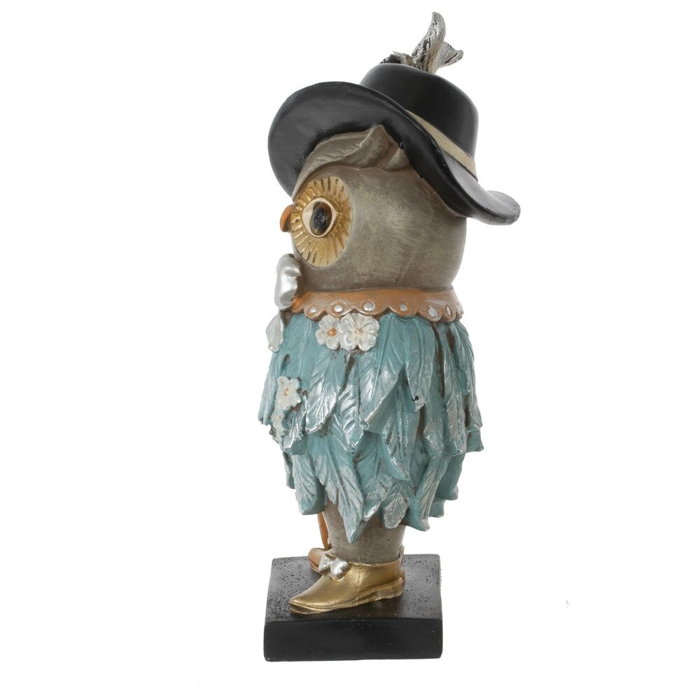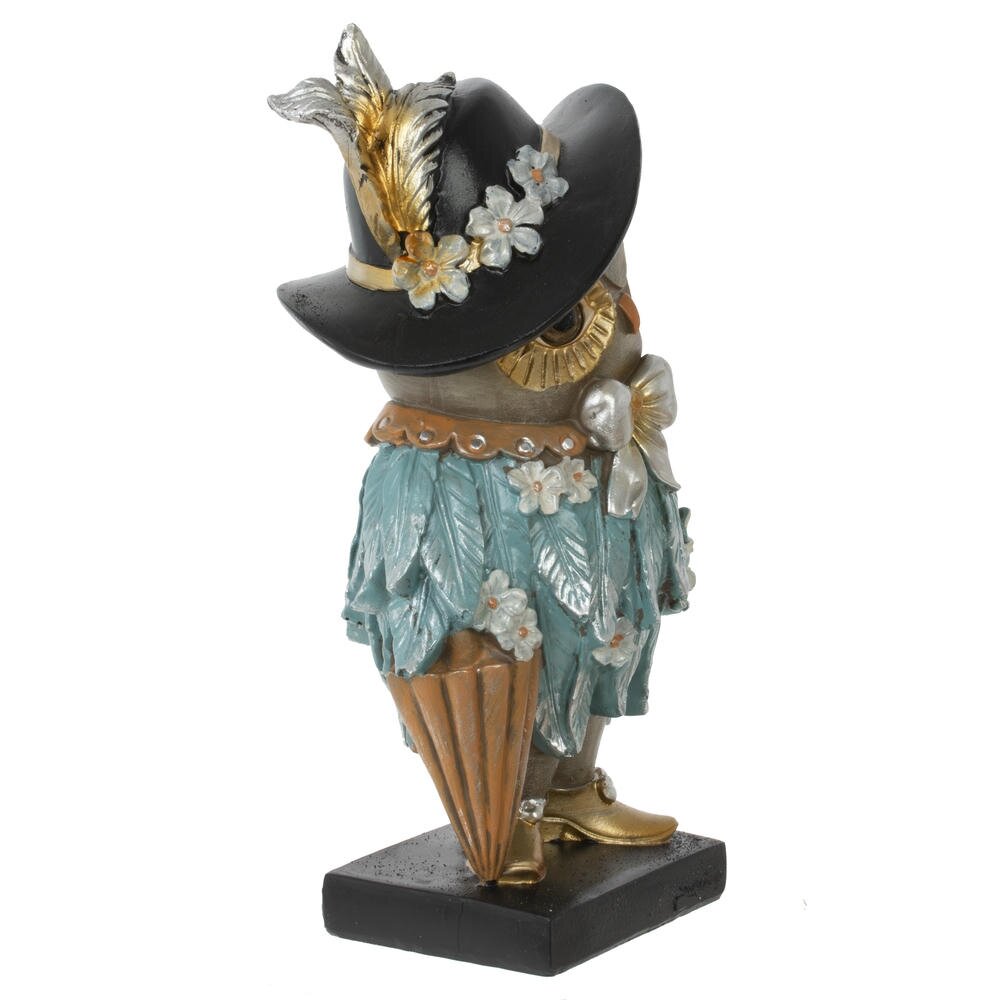 Изящная декоративная фигурка совы станет ярким акцентом в интерьере и оригинальным подарком для ценителей необычных деталей. Сова выполнена в образе светской леди: она стоит на аккуратной подставке, в элегантных золотистых ботиночках, держит зонт и одета в «платье» из резных перьев нежно бирюзового цвета, украшенных белыми цветами. Особое внимание привлекает стильная шляпка с пером и цветочным декором, а также крупный серебристый бант на шее. Тонкая проработка деталей, сочетание матовых и блестящих золотых оттенков создают ощущение утончённой роскоши. Фигурка гармонично впишется в гостиную, спальню или кабинет, добавив уюта и сказочного настроения, и станет отличным элементом коллекции декоративных статуэток.