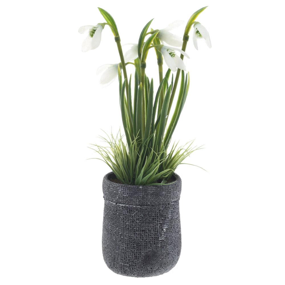 Цветочная композиция «Подснежники» — изящный акцент для интерьера. Нежные белые колокольчики со светло-зелёными сердцевинами и тонкими вытянутыми листьями собраны в аккуратный кустик и помещены в лаконичный тёмно-серый горшок с фактурной поверхностью. Полимерные материалы правдоподобно передают матовость лепестков и упругость стеблей, долго сохраняют форму и цвет, не требуют полива и особого ухода — достаточно периодически смахивать пыль. Нейтральная гамма и компактный размер делают композицию универсальным украшением для стола, полки или подоконника, а также приятным подарком, который добавит в пространство ощущение свежести и ранней весны.