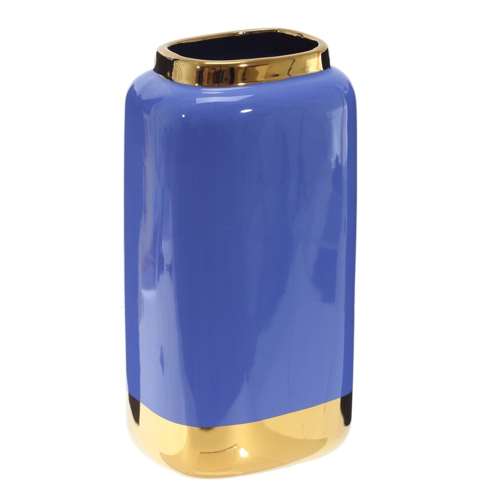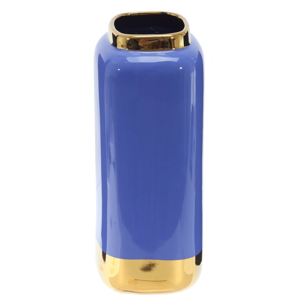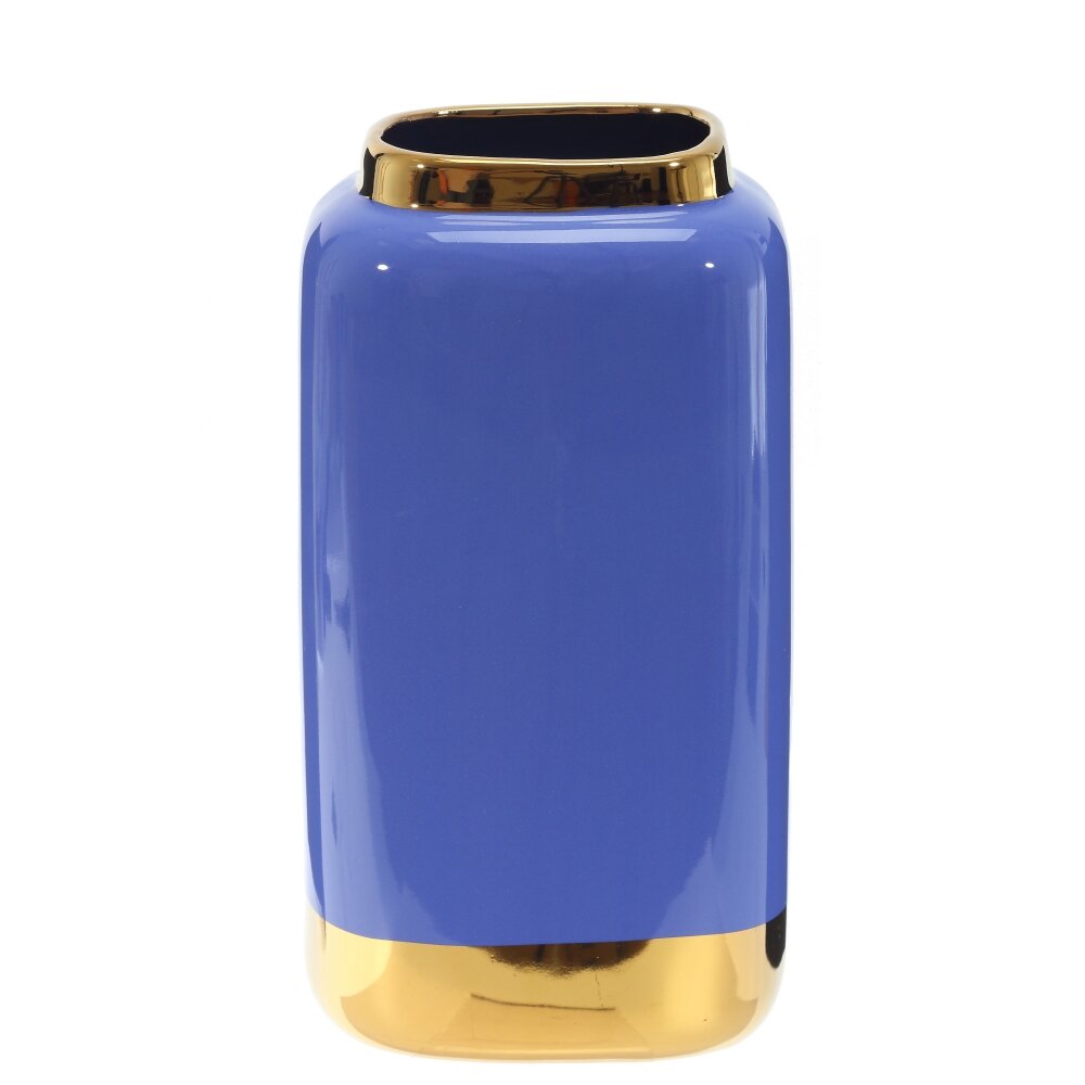 Эта элегантная ваза объемом 1700 мл изготовлена из высококачественного фарфора и отличается изысканным дизайном. Ее корпус окрашен в насыщенный синий цвет, а верхний и нижний края украшены глянцевыми золотистыми вставками, придающими изделию дорогой и стильный вид. Ваза имеет современную прямоугольную форму с плавно закругленными краями, что делает ее универсальным элементом интерьера. Она прекрасно подойдет для живых или искусственных цветов, а также может выступать в роли самостоятельного декоративного элемента. Эстетичное сочетание синего и золотого цветов придаст помещению нотки роскоши и элегантности, идеально вписываясь как в классические, так и в современные интерьеры. Размер горловины: 8*6 см.