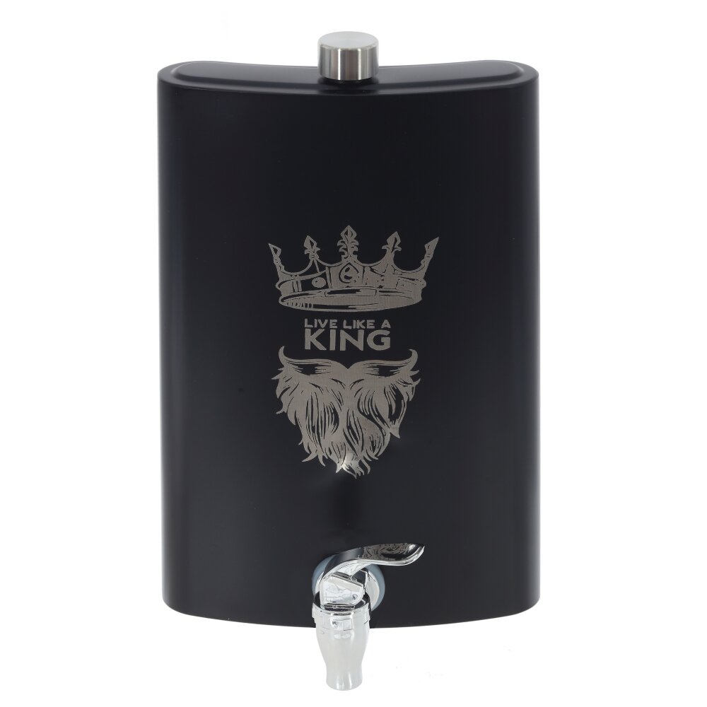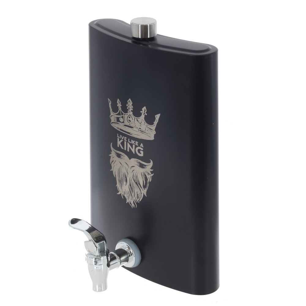 Фляжка объемом 1900 мл — это идеальное решение для тех, кто ценит удобство и стиль. Изготовленная из коррозионностойкой стали, она гарантирует долговечность и надежность в использовании, что особенно важно для активных людей. Уникальная особенность данной фляжки — съёмный краник, который значительно упрощает процесс переливания жидкости, обеспечивая максимальную комфортность и минимальные усилия. Cтильный черный цвет делает аксессуар универсальным и привлекательным. Элегантная надпись "King" придаёт фляжке индивидуальности и подчеркивает её статус. С такой фляжкой вам не страшны ни долгие походы, ни поездки на природу — она всегда станет верным спутником в любом приключении.