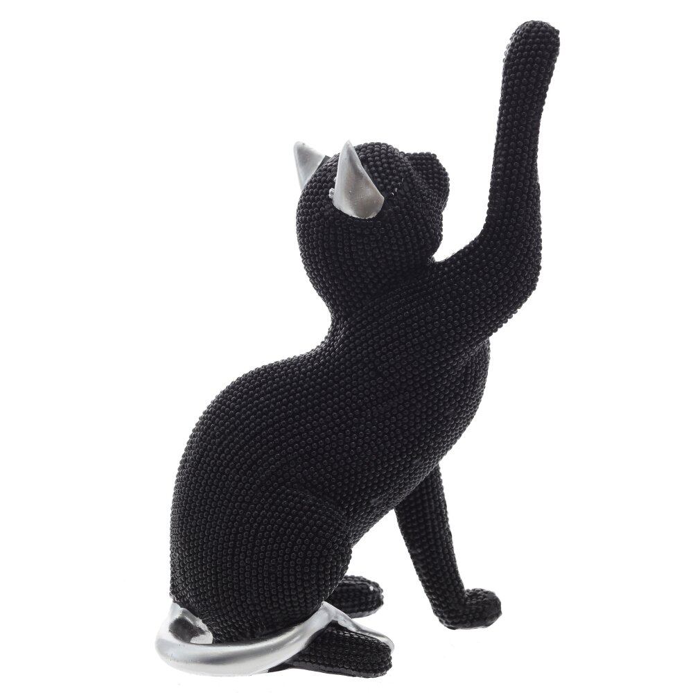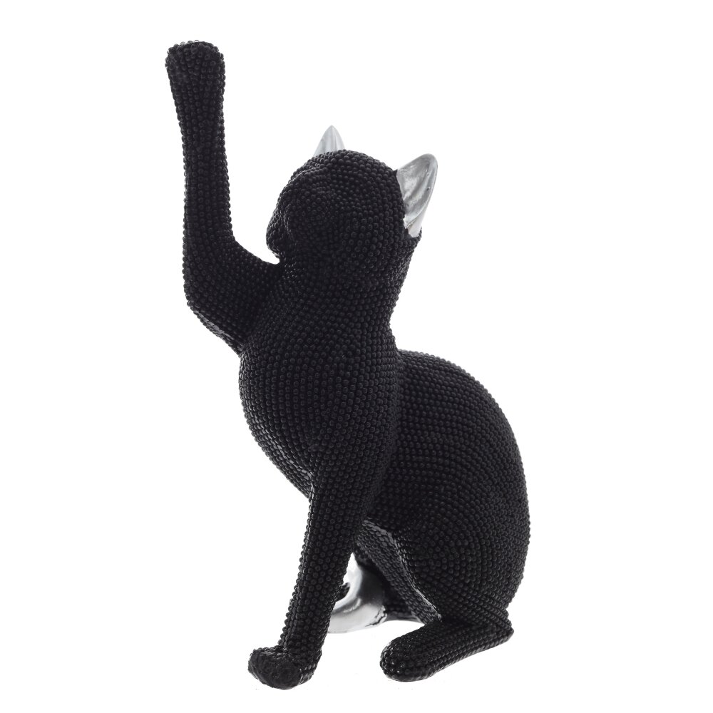 Декоративная фигурка "Кошка" — стильное и элегантное украшение для вашего интерьера. Изготовлена из высококачественных полимерных материалов, что обеспечивает её долговечность и устойчивость к внешним воздействиям. Черная поверхность фигурки украшена мелкими рельефными элементами, придающими ей оригинальный вид и приятную текстуру. Серебристые ушки  добавляют изысканности и делают её настоящим акцентом в любом пространстве. Кошка изображена в элегантной позе, поднимая одну лапу, что символизирует дружелюбие и изящество. Эта фигурка станет прекрасным дополнением к вашему интерьеру, будь то гостиная, кабинет или спальня, а также отличным подарком для любителей стильных аксессуаров и кошек.