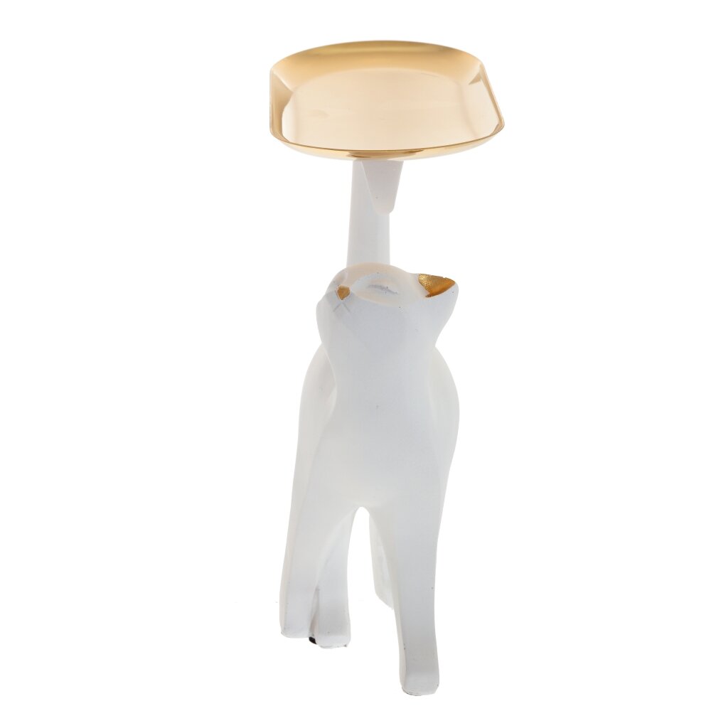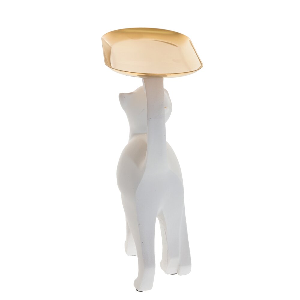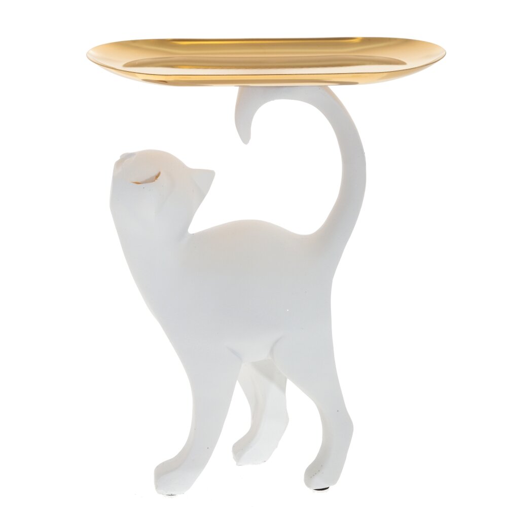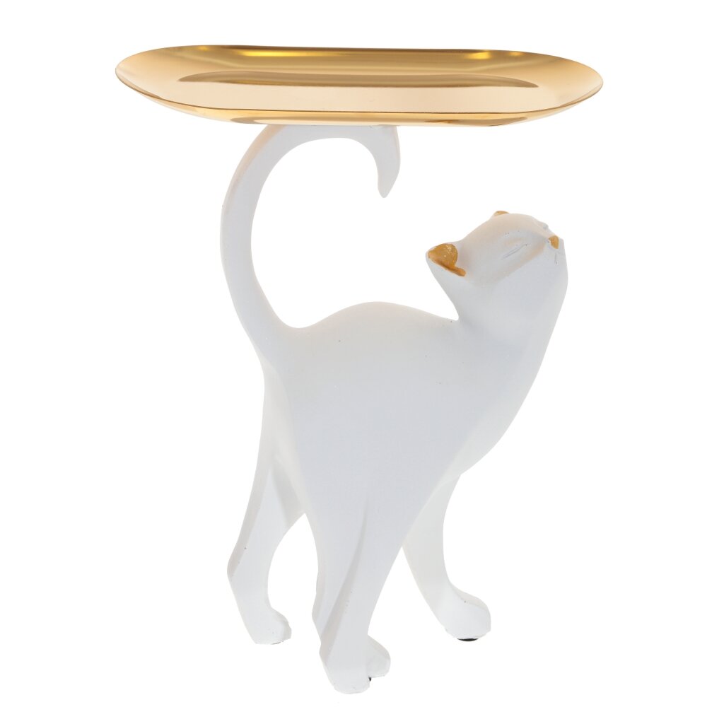 Элегантная декоративная фигурка в виде стройной чёрной кошки с изящно выгнутым хвостом и приподнятой мордочкой станет стильным акцентом в любом интерьере. На хвосте кошки закреплён металлический поднос тёплого золотистого оттенка, который можно использовать как миниатюрную подставку для ключей, украшений, часов или мелких аксессуаров. Контраст матового чёрного корпуса и блестящей золотой поверхности придаёт изделию современный и утончённый вид. Такая фигурка идеально подойдёт для гостиной, спальни, рабочего стола или прихожей, а также послужит оригинальным подарком любителям кошек и необычного декора.