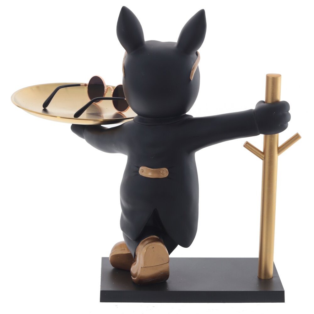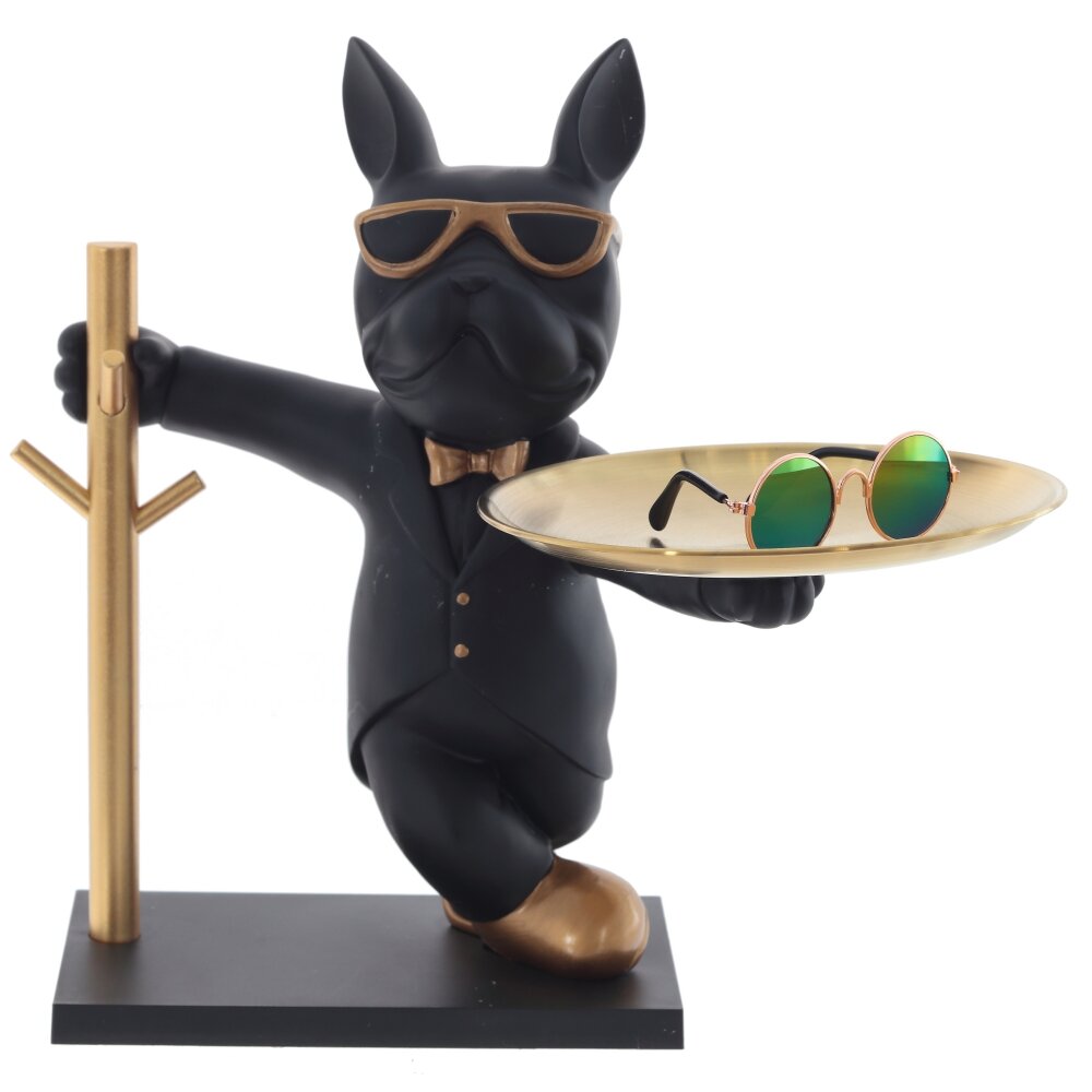 Фигурка выполнена в виде элегантного бульдога, который, кажется, вышел прямо из модного журнала. Егопиджак и сияющая золотая бабочка делают этого четвероногого друга настоящей звездой любого интерьера. Нет ничего более привлекательного, чем сочетание классического черного цвета и эффектного золотого акцента. Бульдог уверенно держит в своих лапках золотой поднос, готовый предложить своим хозяевам что-то особое, будь то угощение или милый сувенир. Очки на его глазах придают ему дополнительный шарм и интеллект, а шикарный образ создает атмосферу элегантности и радости.