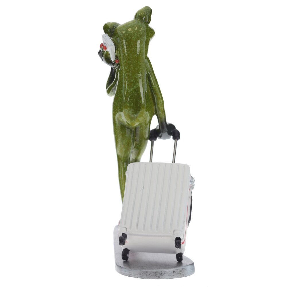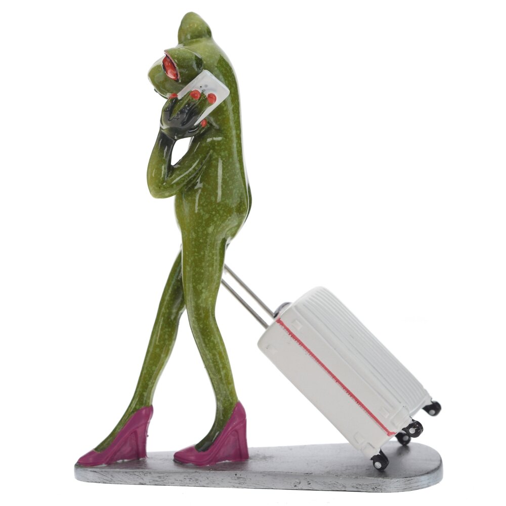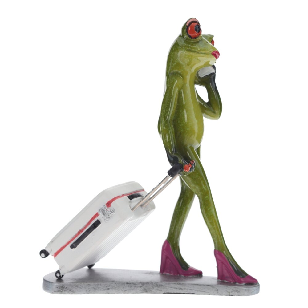 Фигурка Лягушки в ярких туфлях сразу привлекает внимание своим необычным стилем. Лягушка везет белый чемодан, который намекает на постоянные путешествия. Так же интересное в ней то, что она уверенно держит телефон и ведет разговор. Фигурка может стать прекрасным подарком для тех, кто модный и стильный, с активным образом жизни и коммуникабельностью.