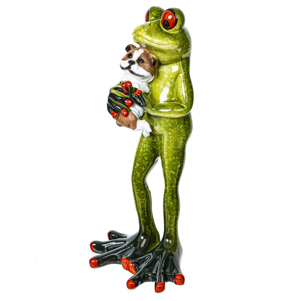 Фигурка лягушки, которая прижимает к себе маленькую собачку, представляет собой очаровательную сцену дружбы и заботы между животными. Лягушка изготовлена из полимерных материалов, имеет яркую зеленую окраску. Ее передние лапки ласково обнимают собачку, которая выглядит безмятежной и доверчивой.
