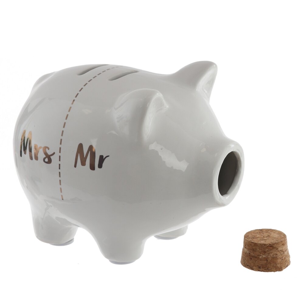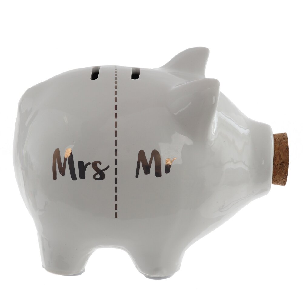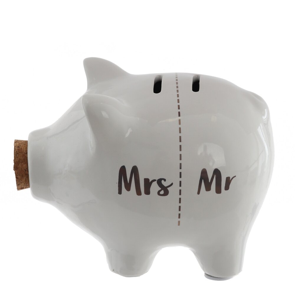 Очаровательная свинка украшена лаконичной надписью:  Mrs/Mr, что делает копилку особенно удачным вариантом для пары или в качестве символичного подарка.