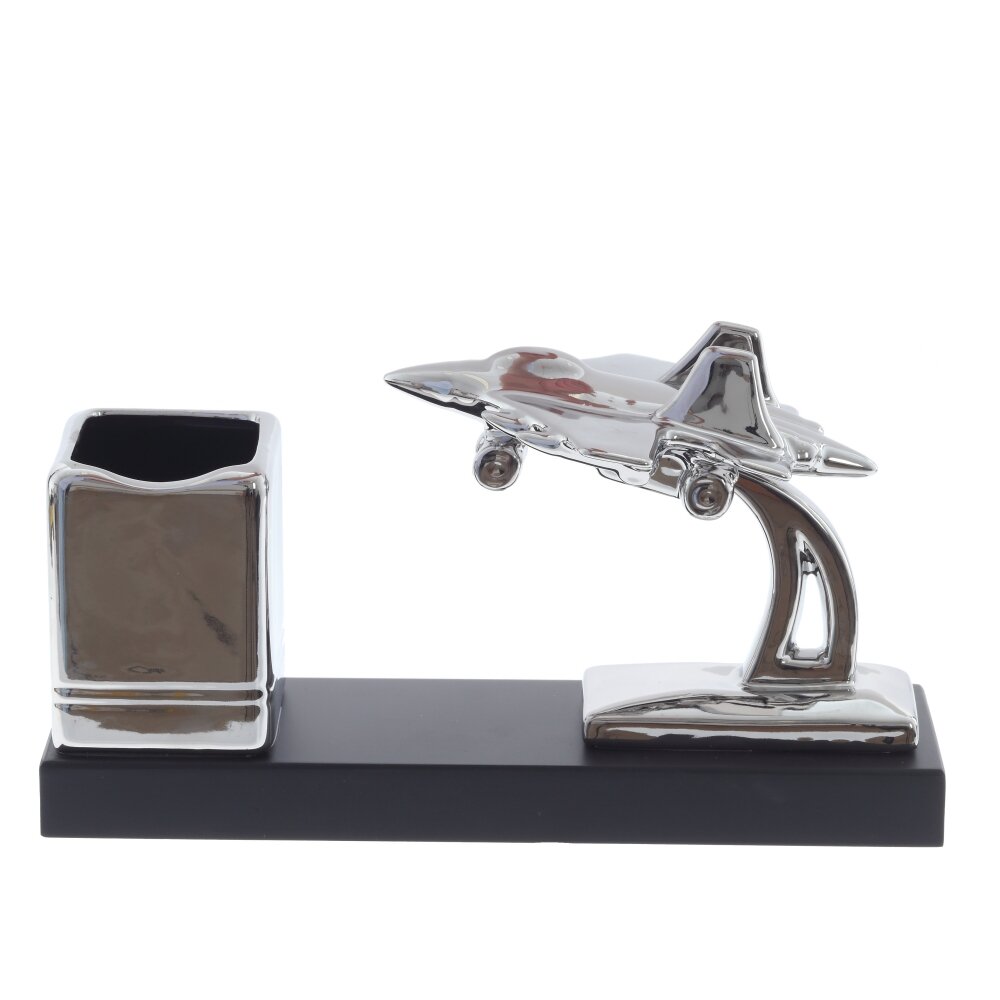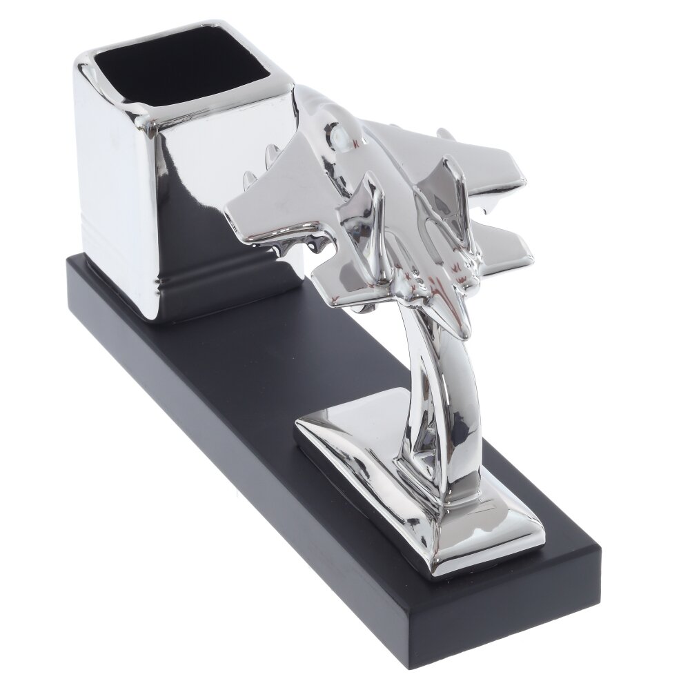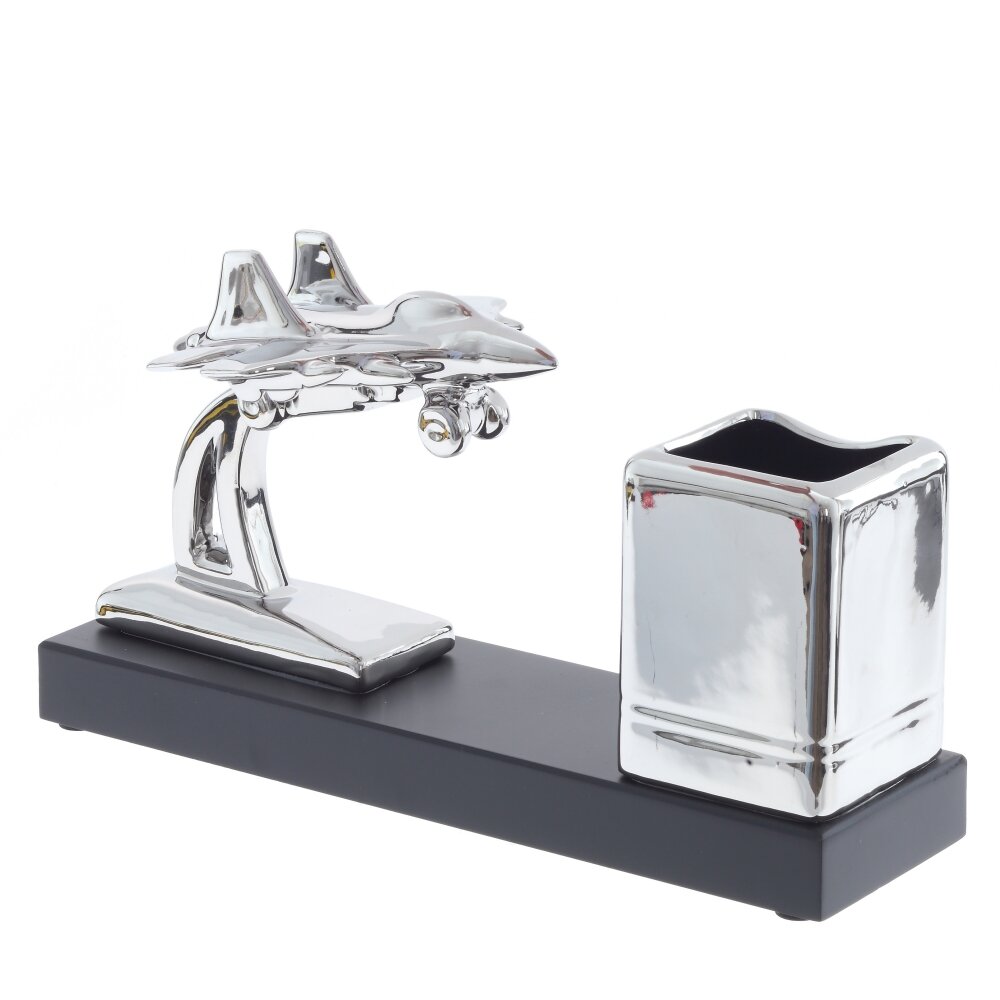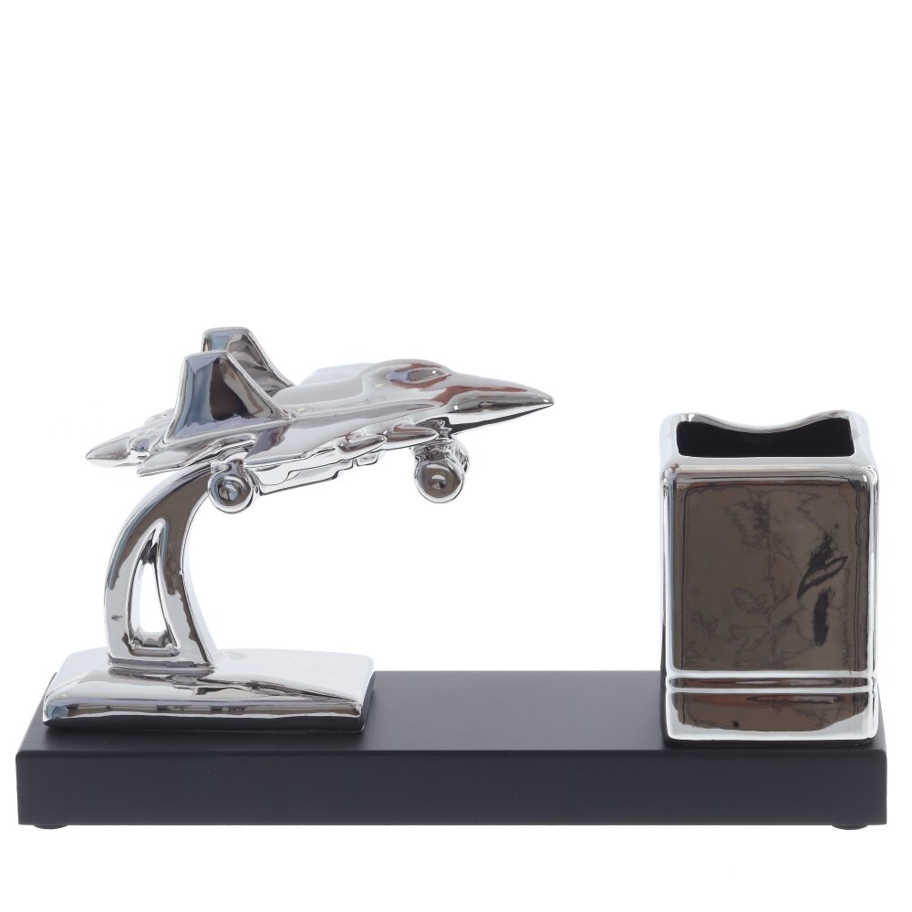 На изображении представлена оригинальная подставка для письменных принадлежностей, выполненная из фарфора. Изделие отличается современным и стильным дизайном: на прочном прямоугольном основании черного цвета установлены два декоративных элемента — фигурка серебристого самолёта, словно парящего в воздухе, и вместительный стакан для ручек, карандашей или других канцелярских мелочей. Глянцевая поверхность придает подставке элегантный вид, а необычный мотив авиации подчеркнет индивидуальность рабочего пространства. Размеры подставки составляют 28 см в длину, 7,5 см в ширину и 15,5 см в высоту, что позволяет разместить ее на любом столе без ущерба для удобства. Такой аксессуар не только практичен, но и способен стать украшением кабинета, особенно понравится любителям авиации или необычных дизайнерских решений.