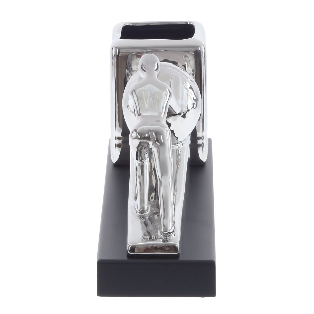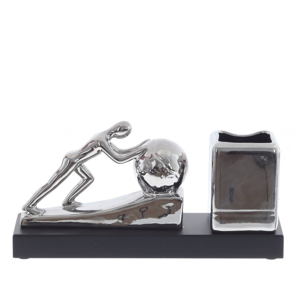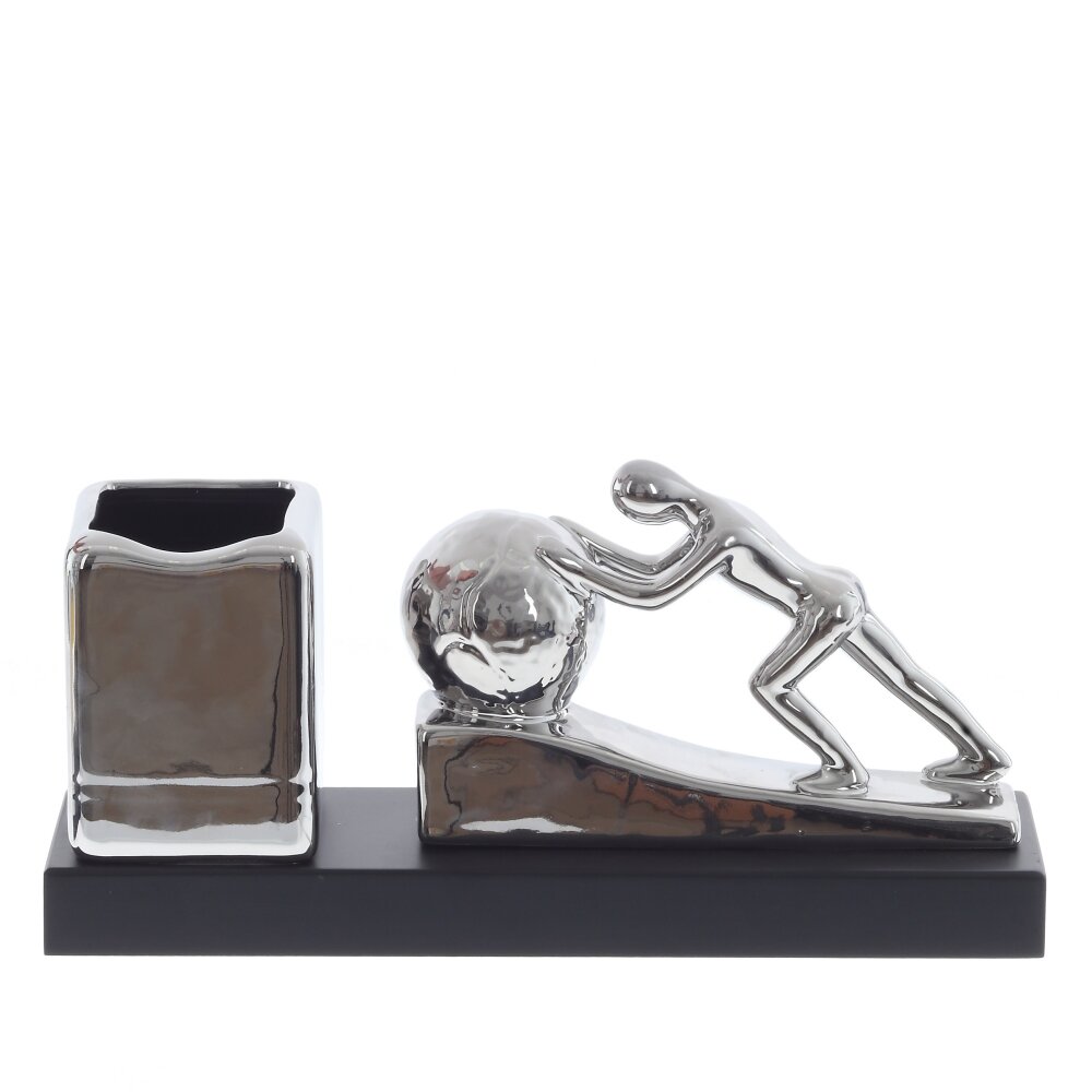 На изображении представлена оригинальная подставка для письменных принадлежностей, выполненная из фарфора с глянцевым хромированным покрытием. Её размеры составляют 28 см в длину, 8 см в ширину и 16,5 см в высоту. Главная декоративная часть подставки — скульптурная фигура человека, который с усилием катит большой шар, напоминающий знаменитый образ Сизифа из древнегреческой мифологии. Эта деталь символизирует настойчивость и целеустремлённость, что делает аксессуар не только функциональным, но и вдохновляющим элементом для рабочего пространства. Подставка сочетает в себе современный дизайн и глубокий смысл, что позволяет использовать её как стильное украшение офиса или домашнего кабинета. Её строгие формы и блестящая поверхность прекрасно вписываются в любой интерьер, добавляя нотки утончённости и статуса.